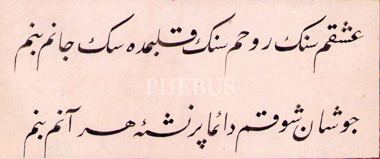 Hoca İşi Ta'lik Beyit, "Aşkım senin ruhum senin kalbimdesin canım benim, Coşan şevkim dâima pür-neş'e her ânım benim", ebrulu, 7x16 cm