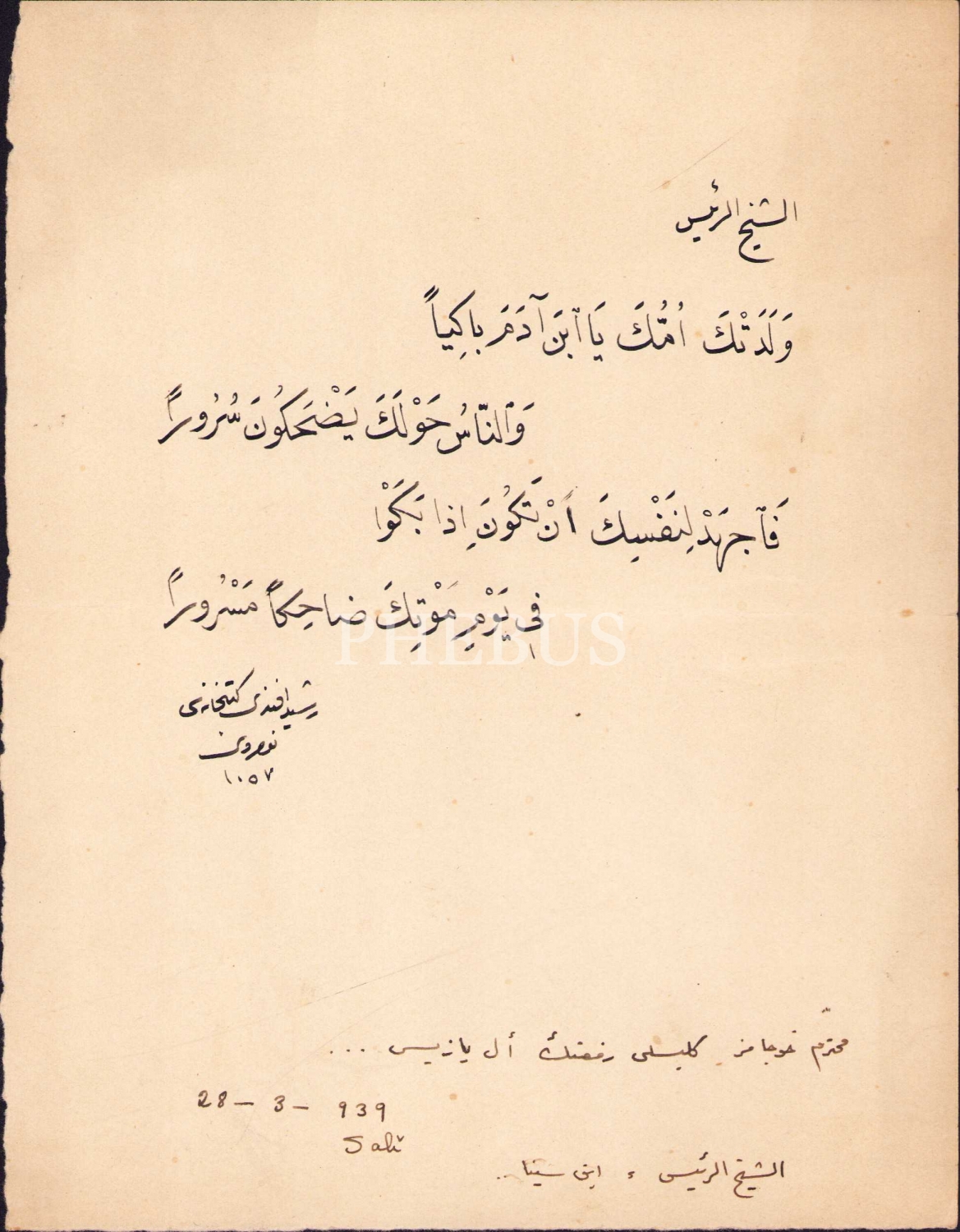 Dîvânü Lügati't-Türk'ü Neşreden Filolog ve Kitâbiyât Âlimi Kilisli Rifat Bilge'nin El Yazısıyla İbn Sina Hakkında Arapça Beyitler, 16x21 cm