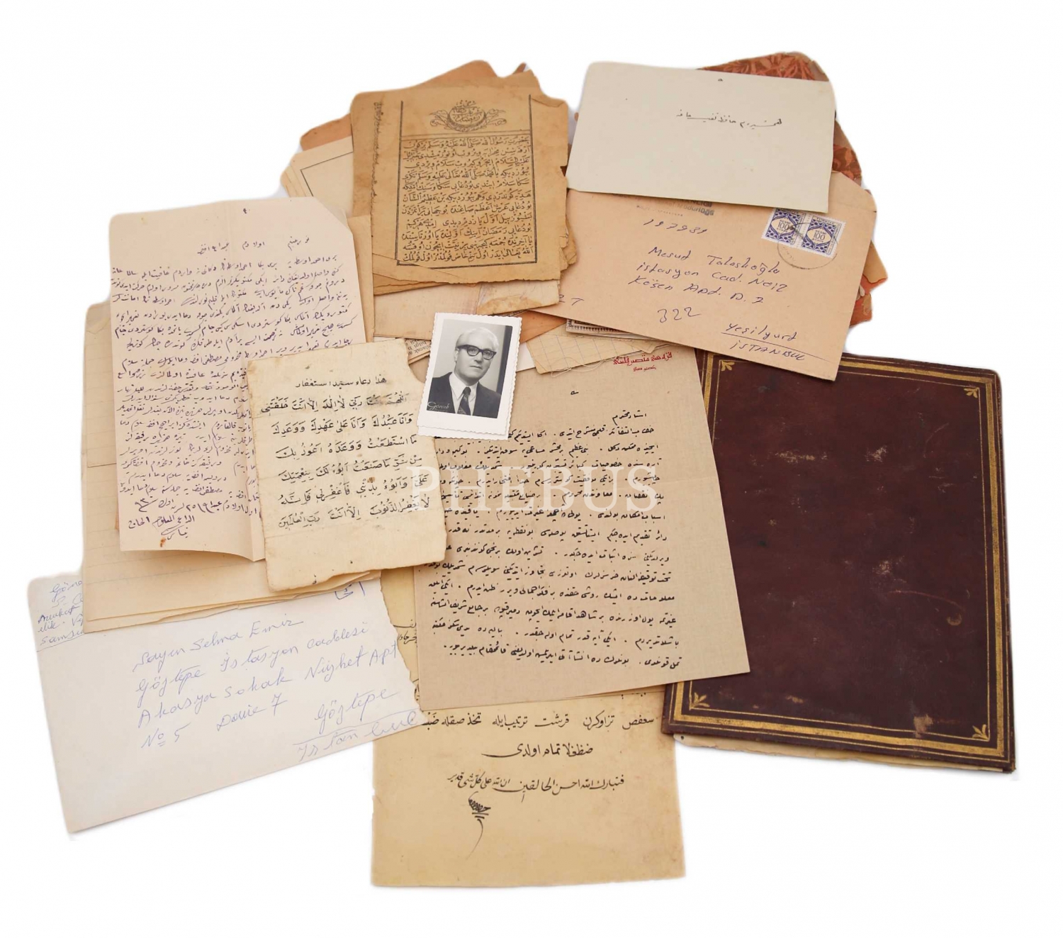 El Yazması Cildi İçerisinde Yazma ve Matbu Muhtelif Dua Varakları ve Şiirler Bulunan Lot, yaklaşık 25 parça halinde, muhtelif ebatlarda