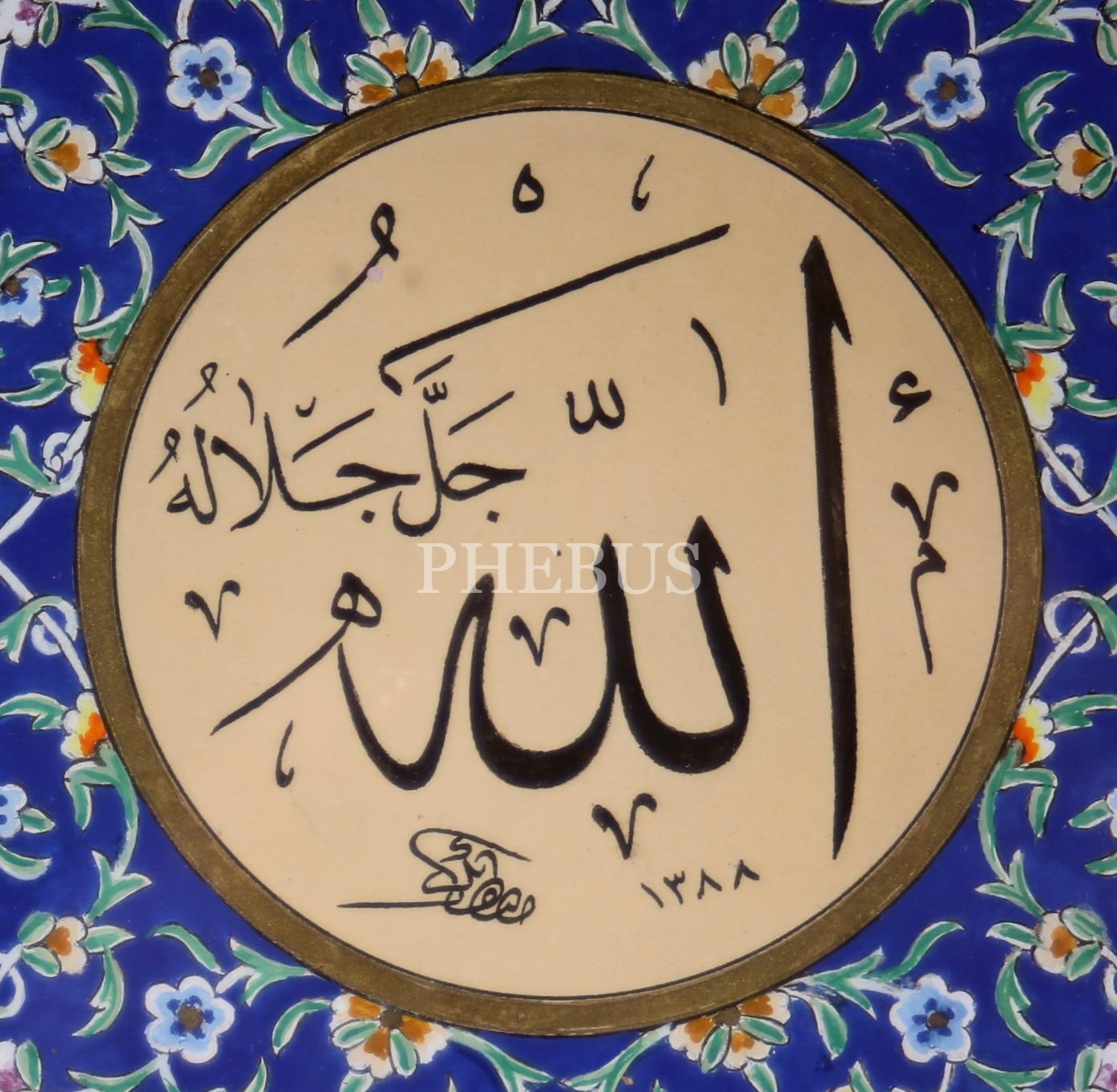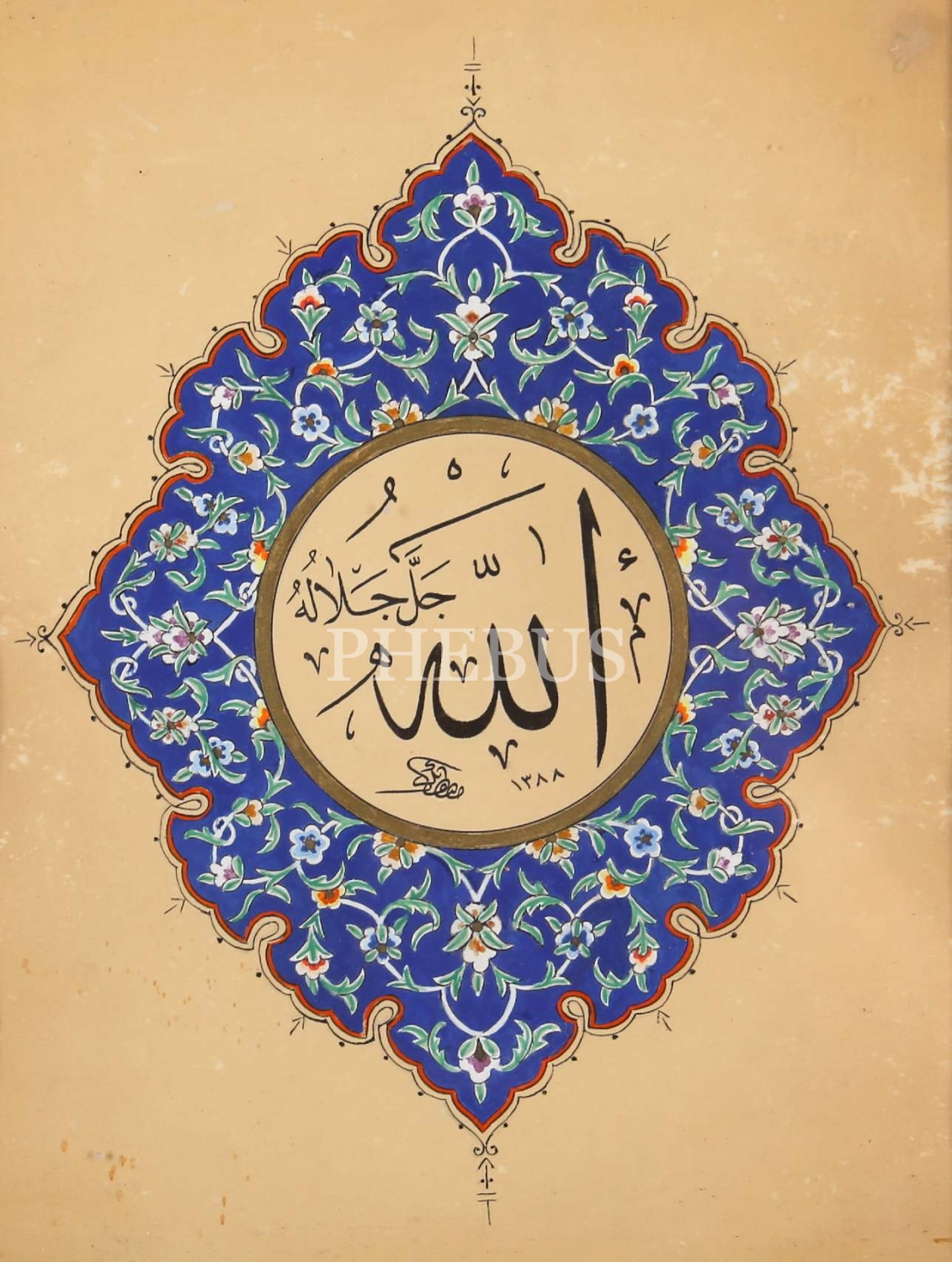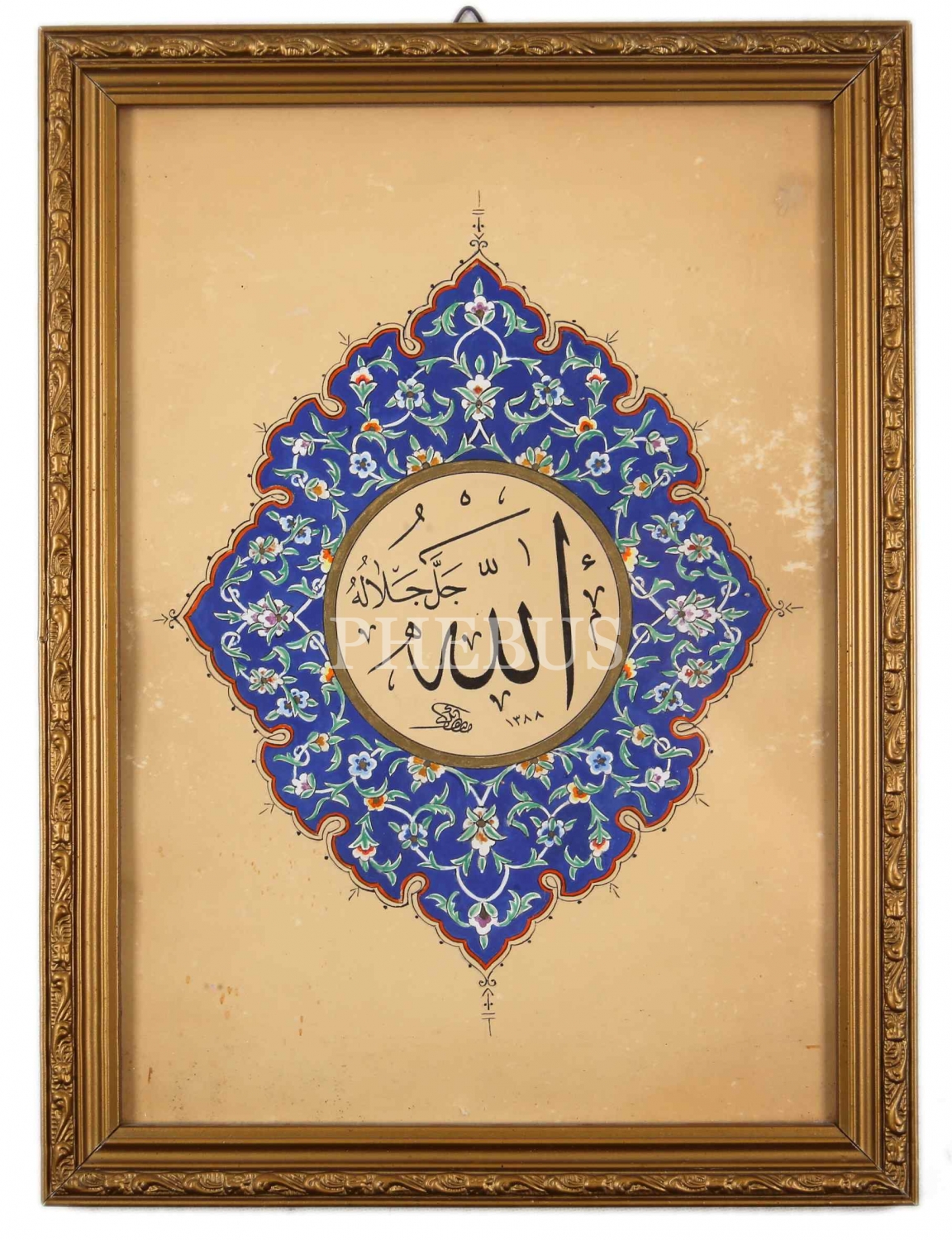 Sülüs Lafzatullah, Bekir Pekten ketebeli ve 1388 tarihli, tezhipli ve çerçeveli, 8x8 cm
