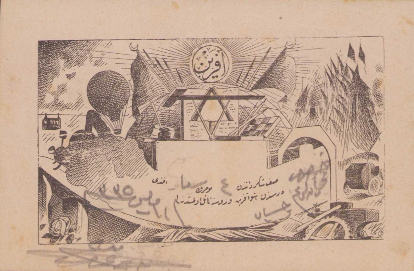 Osmanlıca Aferin, 4. sınıf talebesi Sami Efendi'ye verilen, bilim temalı görsel, 1335 tarihli, 11x8cm