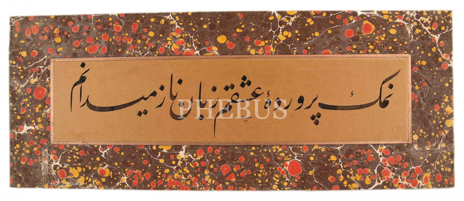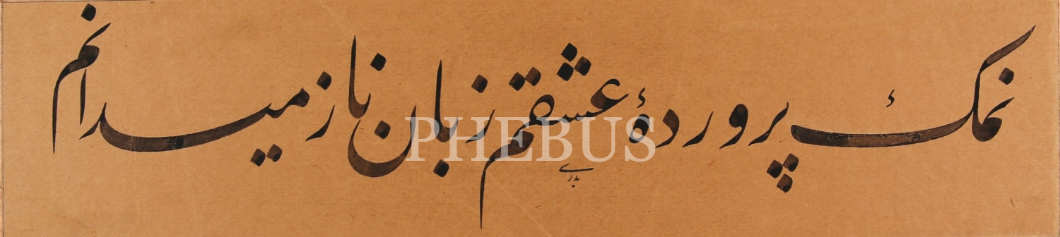 Bedri [Mahmud Bedreddin Yazır] Ketebeli Farsça Celî Ta'lik Beyit, "Nemek perverde-i aşkam/Zeban-i naz mi-danem [Aşkın yetiştirdiğiyim, nâz dilini bilirim]", ebrulu, 10x40 cm