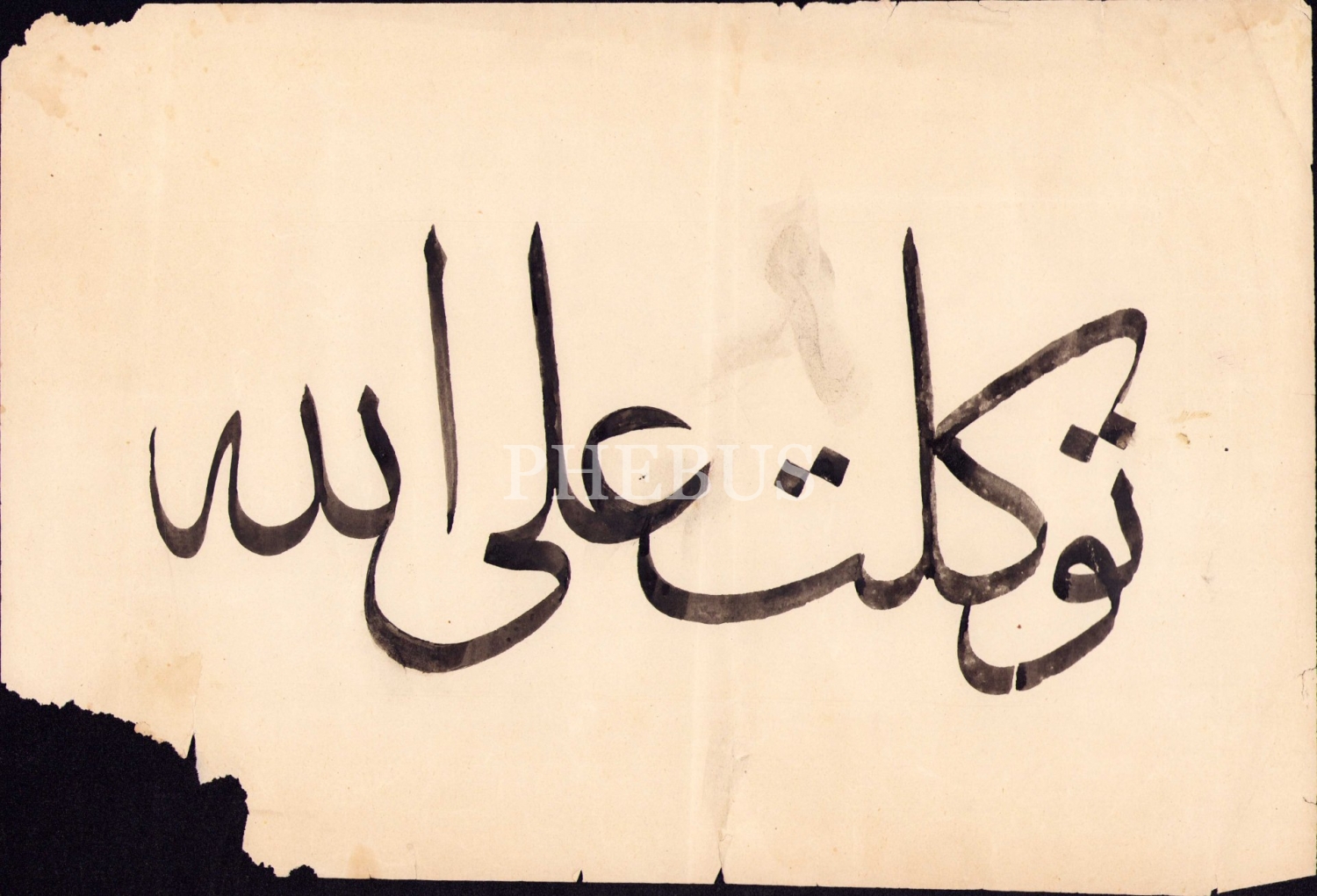 Celî Sülüs Yazı, "Tevekkeltü alâ Allah [Allah'a güvenip dayandım]", 25x37 cm, yıpranmış ve bir köşesi parçalanmış haliyle