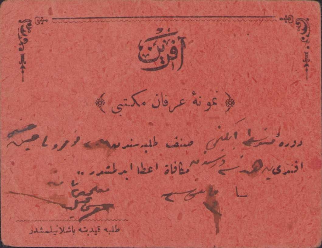 Osmanlıca aferin, Numune-i İrfan Mektebi, 9x7cm