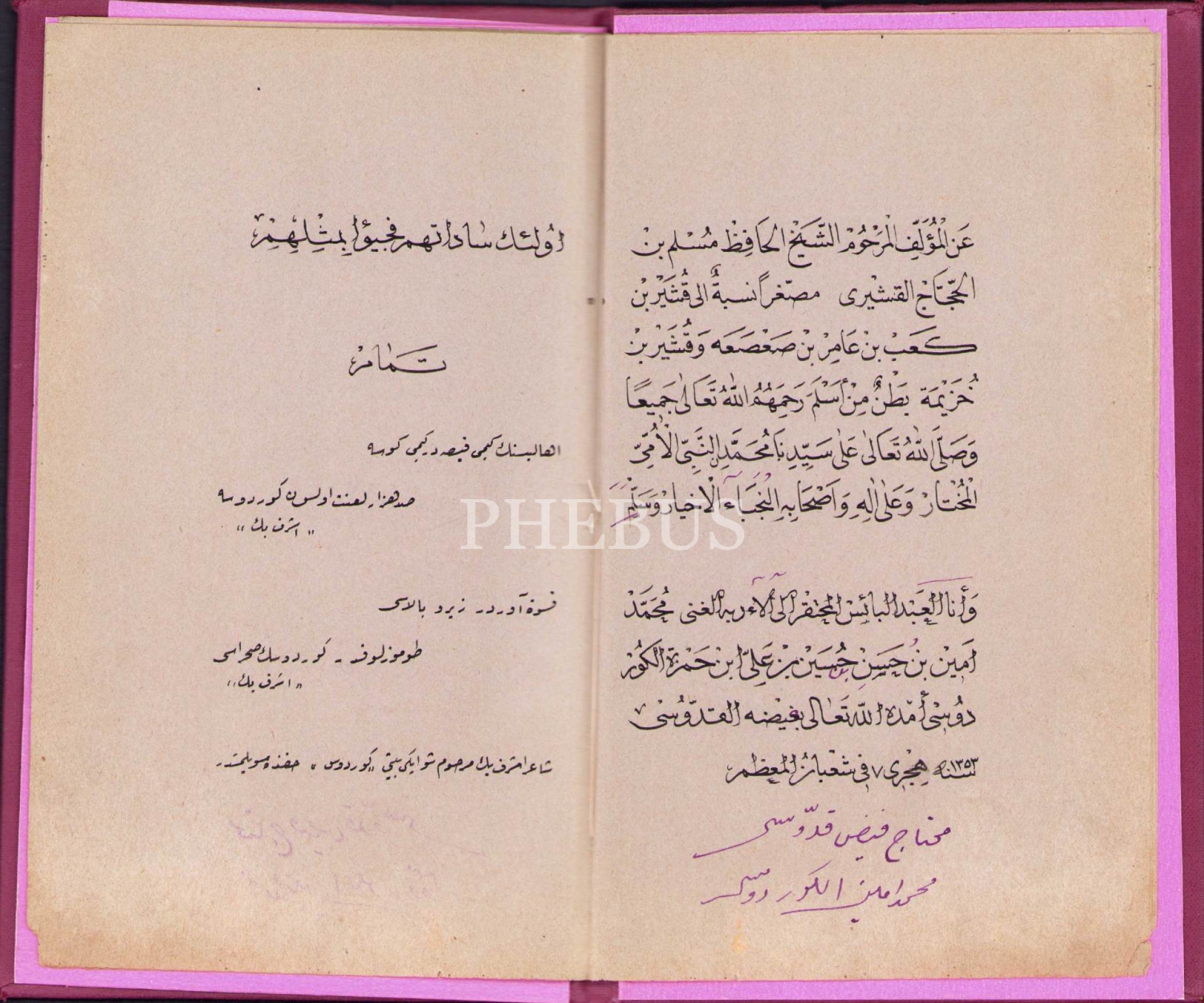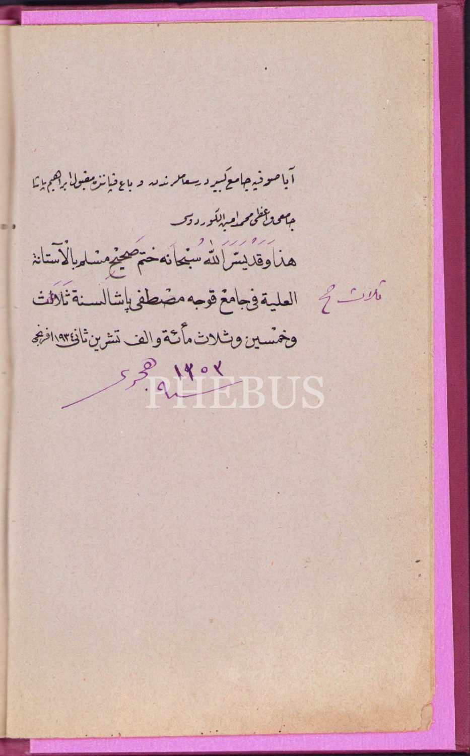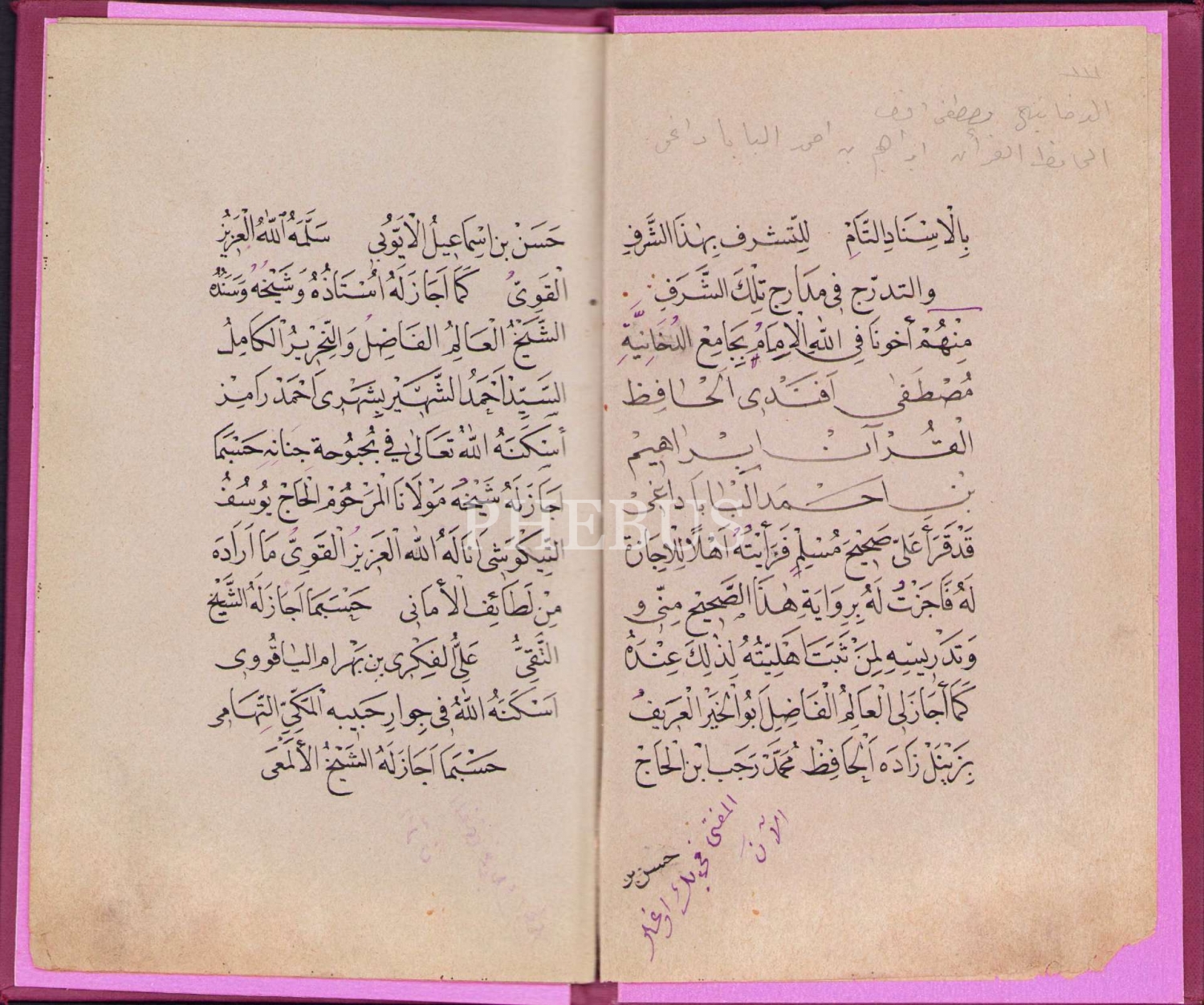 Arapça El Yazması İlmiye İcazetnâmesi [Sahîh-i Müslim [Hadis Kitabı] rivayeti ve okutulması için], İbrahim b. Ahmed el-Babadağî'ye verilmiş, 1353 târihli, 5 varak, 12x20 cm