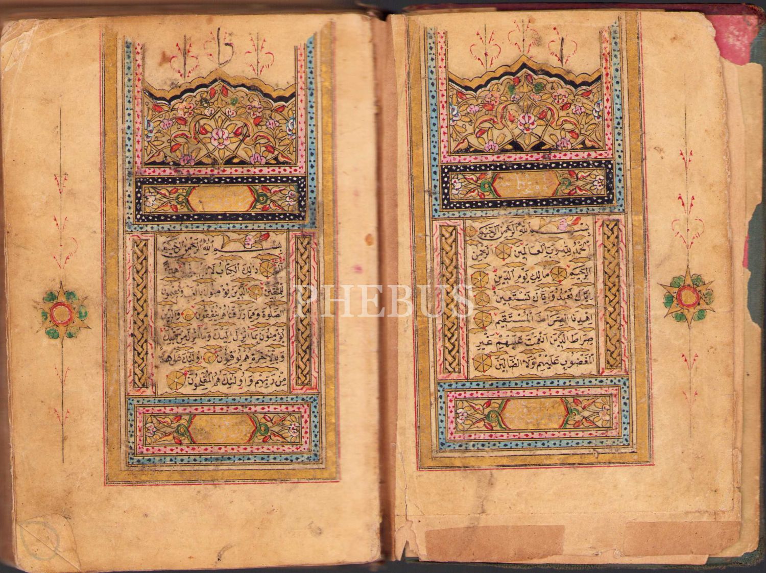 El Yazması Kur'ân-ı Kerîm, tezhipli, 10x15 cm, kahverengi şemseli cildinde, cildi yıpranmış ve kapağı yarı ayrık haliyle