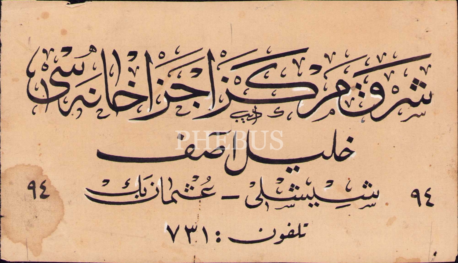 Hoca İşi Sülüs Yazı, "Şark Merkez Eczâhânesi - Şişli", Mustafa Edib ketebeli, 10x17 cm