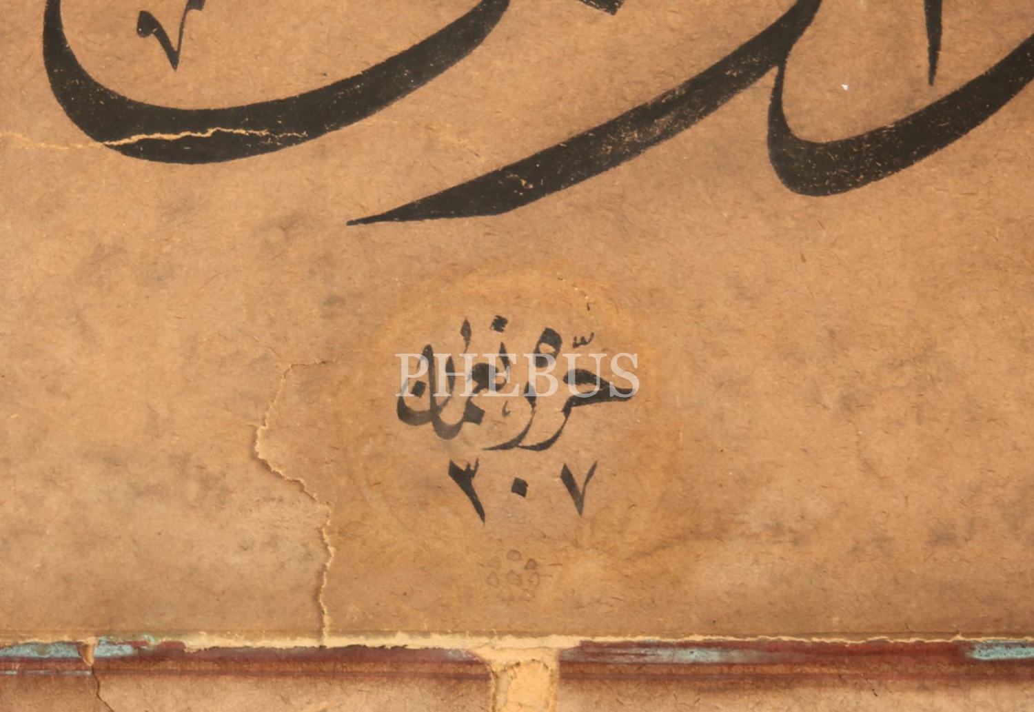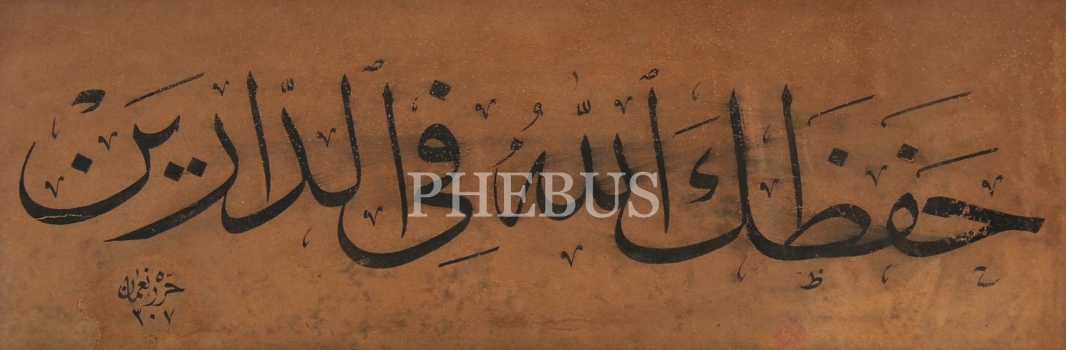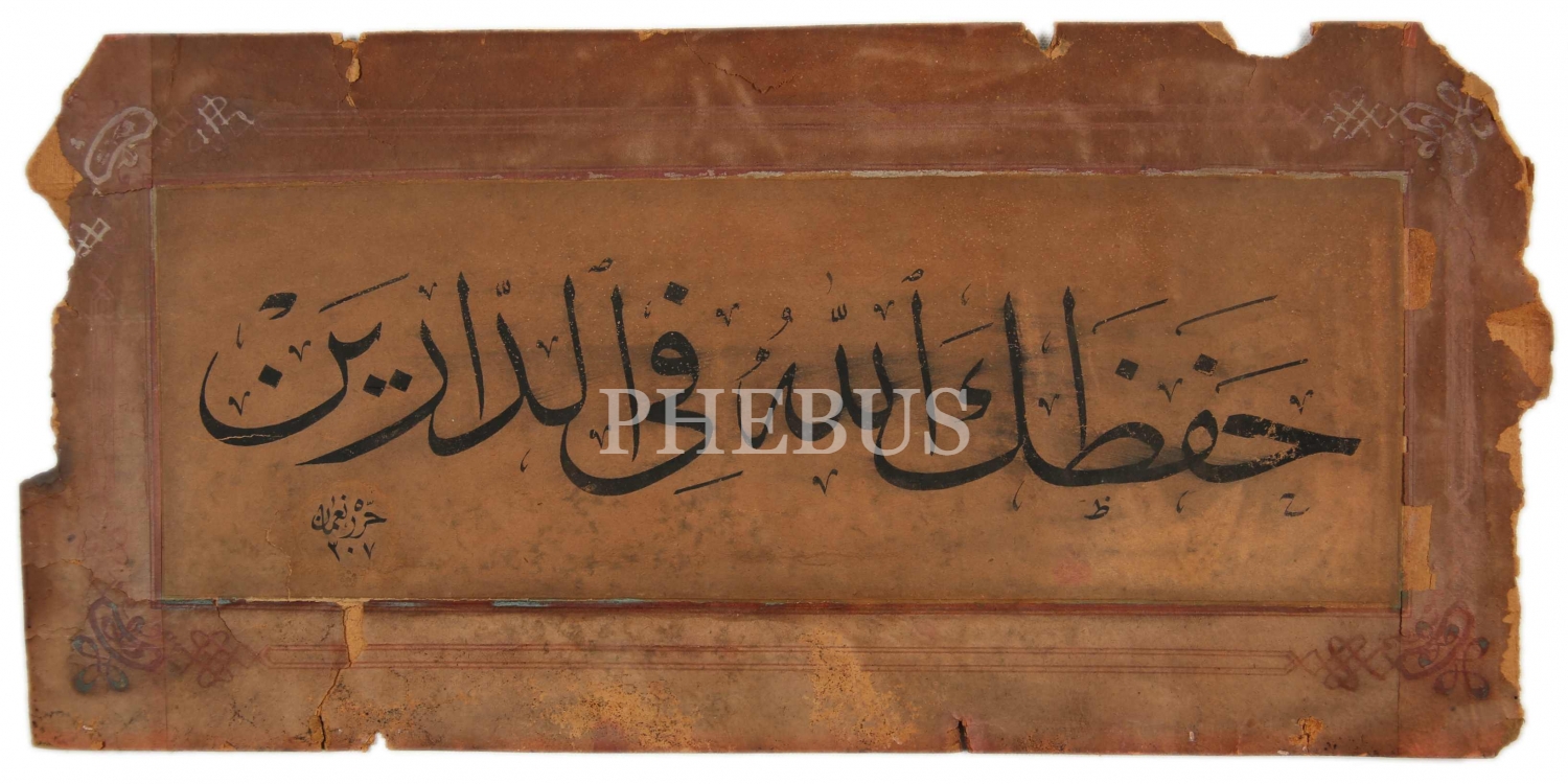 Sülüs Yazı, "Hafazakallahu fi'd-dâreyn [Allah iki dünyada da seni korusun]", Numan ketebeli ve 1307 tarihli, 12x35 cm, yıpranmış ve kenarları parçalanmış haliyle