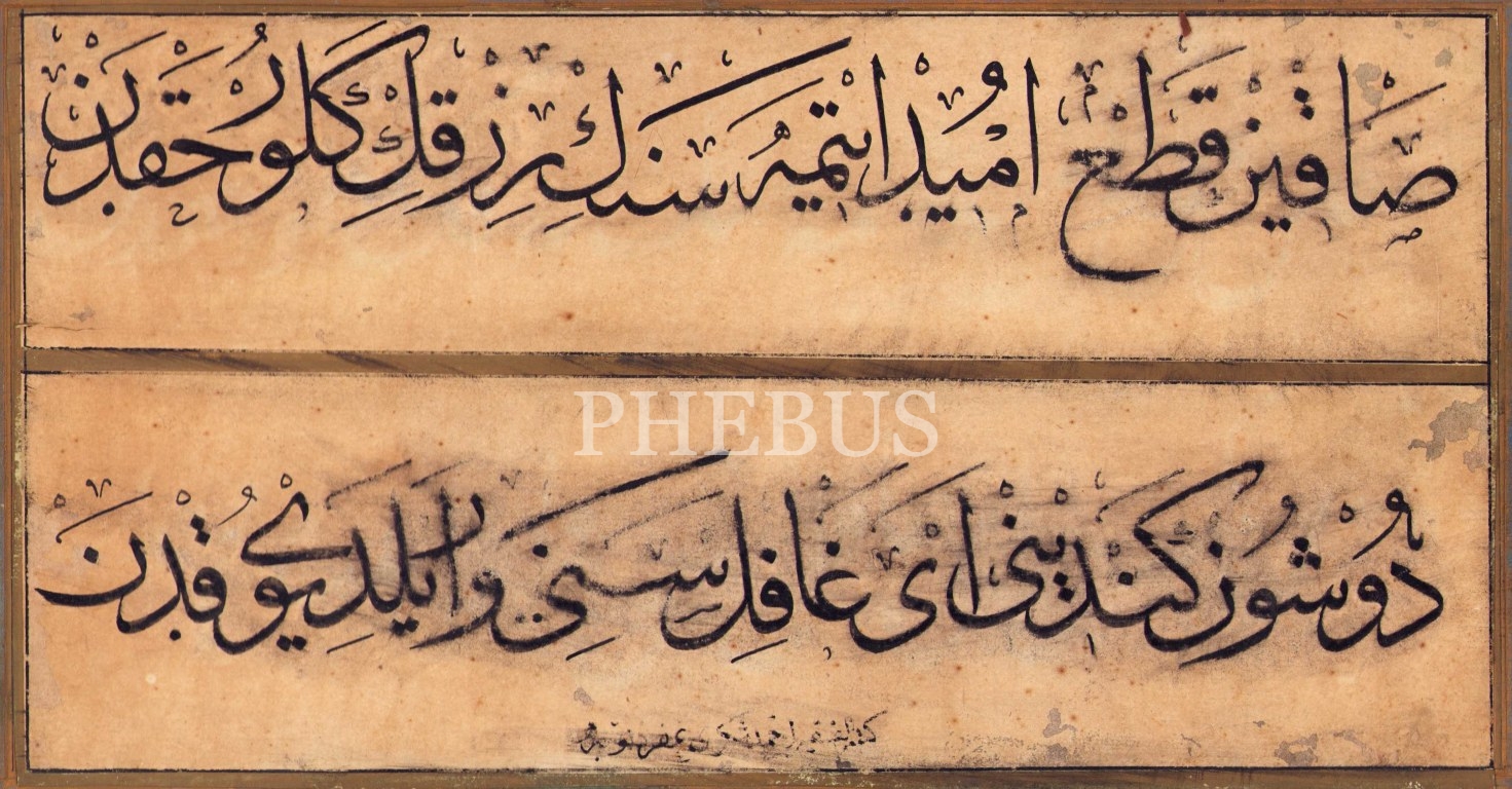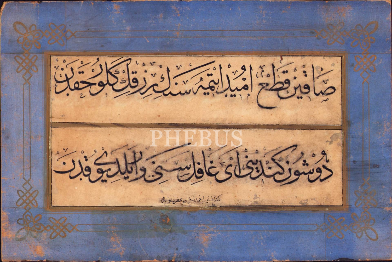 Sülüs Yazı, "Sakın kat'-ı ümid etme senin rızkın gelir Hakk'dan, Düşün ki kendini ey gâfil seni var eyledi yokdan", Ahmed Şükrü ketebeli, altın cetvelli, 15x30 cm