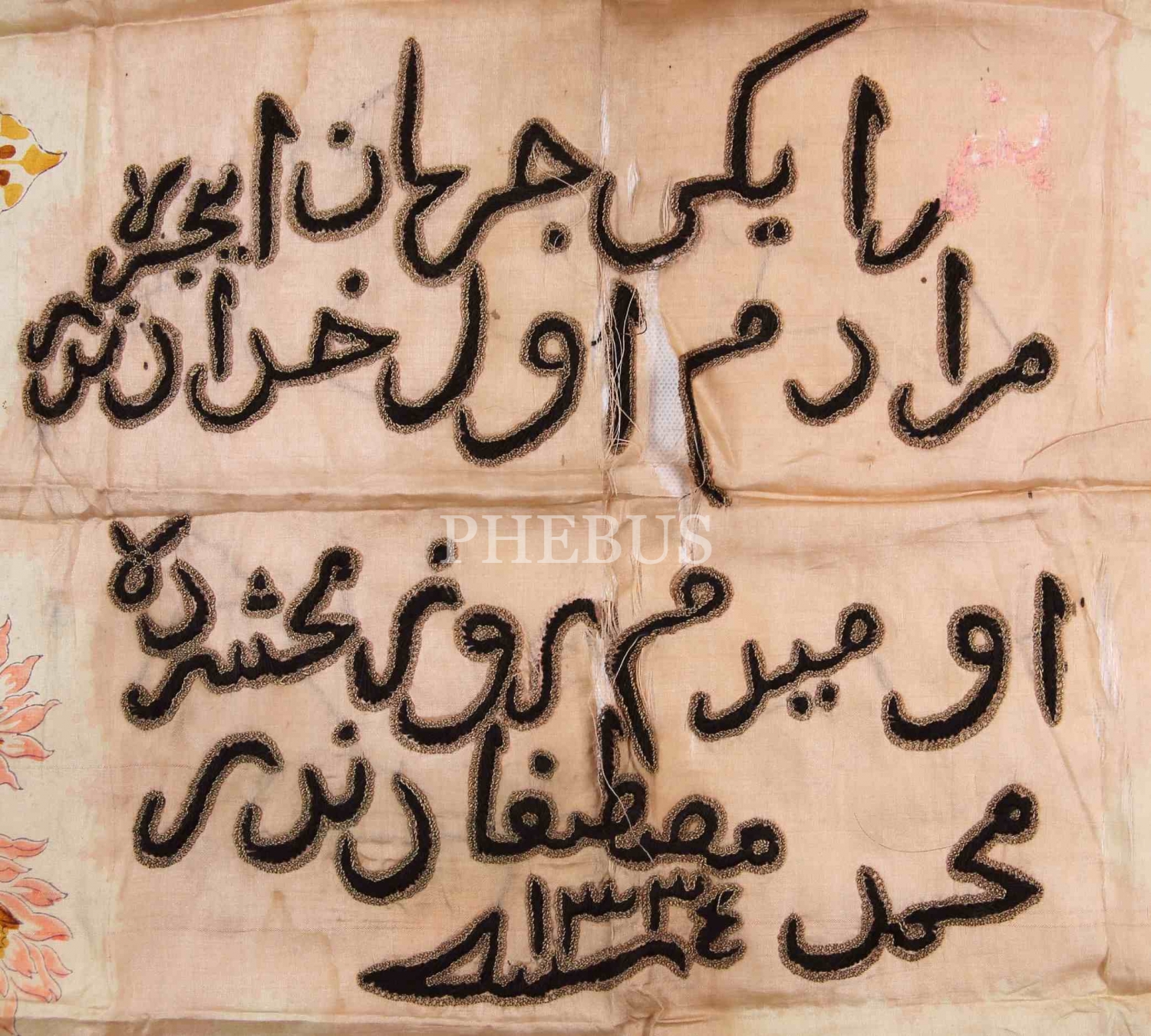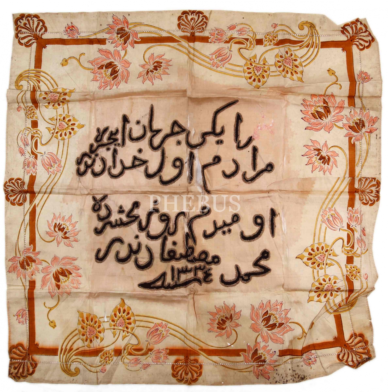 Osmanlıca "Benim İki Cihan İçre Muradım Ol Huda'dandır/ Ümidim Ruz-ı Mahşerde Muhammed Mustafadandır" yazılı İpek Mendil, 1334 tarihli, yer yer aşınmış ve yırtılmış hâliyle, 46x46 cm