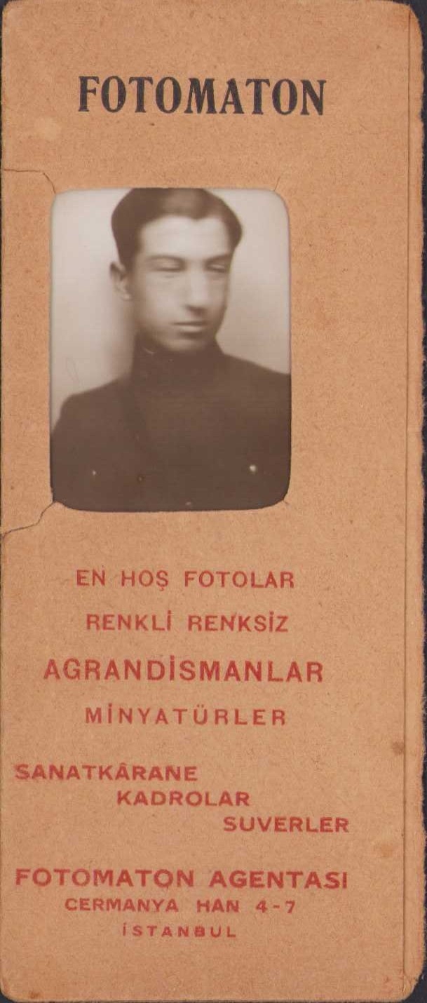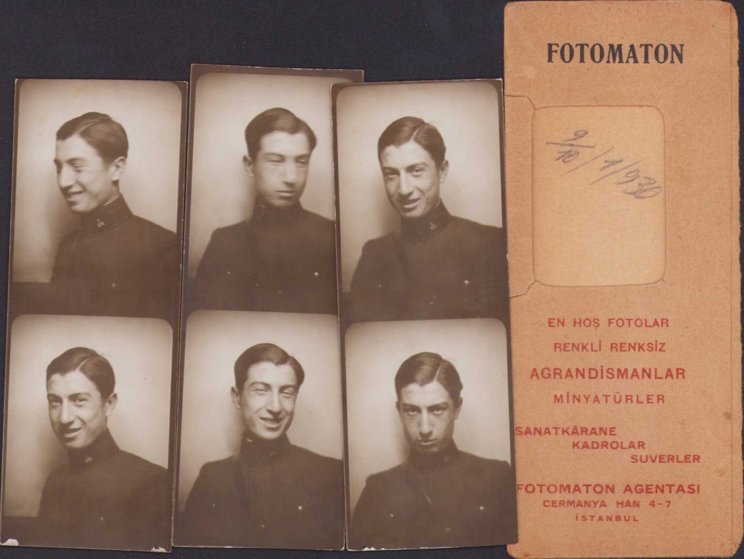 Fotoğraf kabininde (Fotomaton) çekilmiş 6 adet vesikalık fotoğraf, kendi zarfında, 1930 tarihli, Fotomaton Agentası Germanya Han İstanbul adresli, ederi 50 kuruş