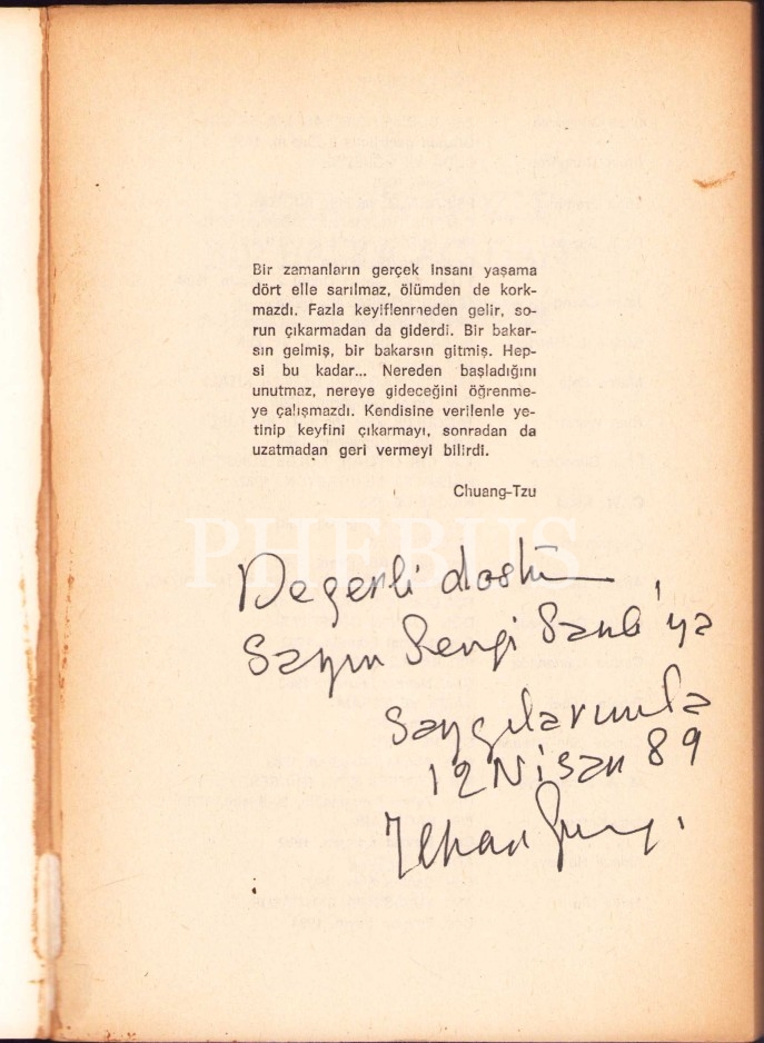 İthaf, "Değerli dostum Sayın Sevgi Sanlı'ya saygılarımla. 12 Nisan 1989" şeklindedir.