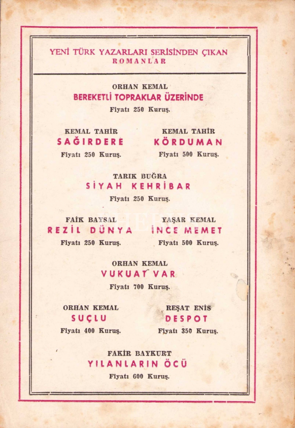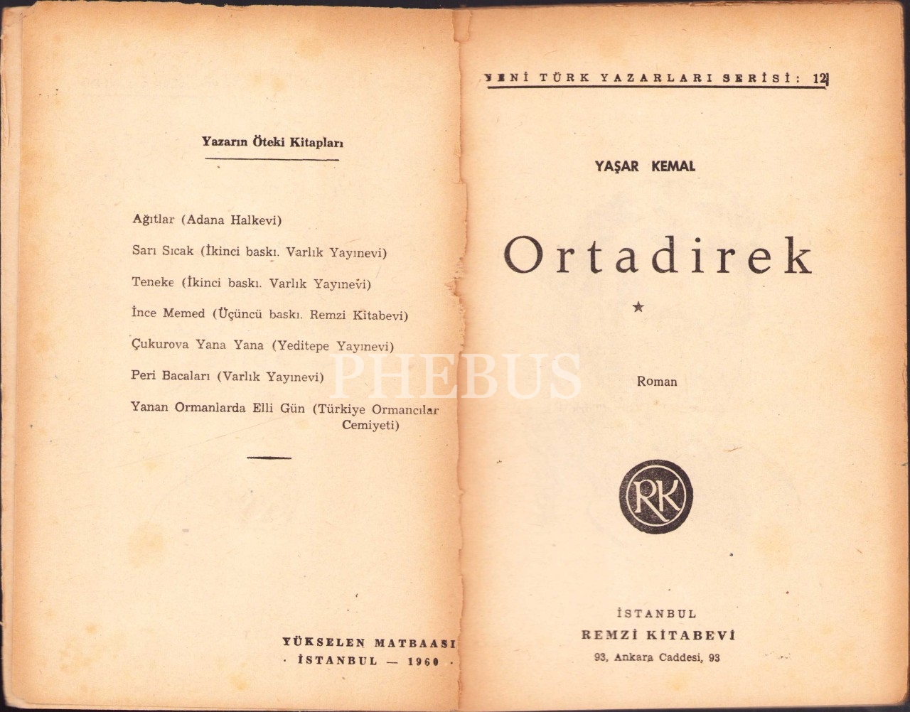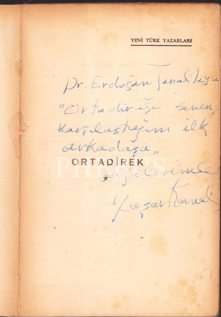 Yaşar Kemal'den Dr. Erdoğan Tanaltay'a İthaflı ve İmzalı ''Ortadirek'', Remzi Kitabevi, İstanbul - 1960