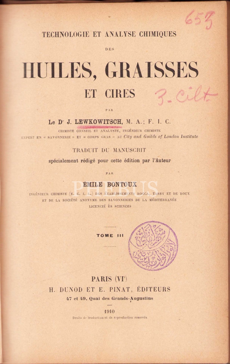 Fransızca Technologie et Analyse Chimiques des Huiles, Graisses et Cires - 3. Cilt, J. Lewkowitsch, Paris 1910, 548 s., 16x24 cm