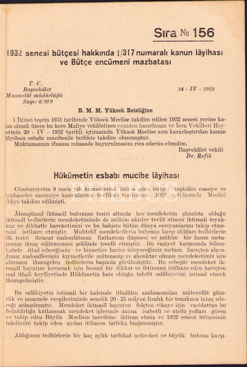 1932 Senesi Bütçe Kanunu Lâyihası ve Bütçe Encümeni Mazbatası, T.B.M.M. Matbaası 1932, 58 s., 20x27 cm