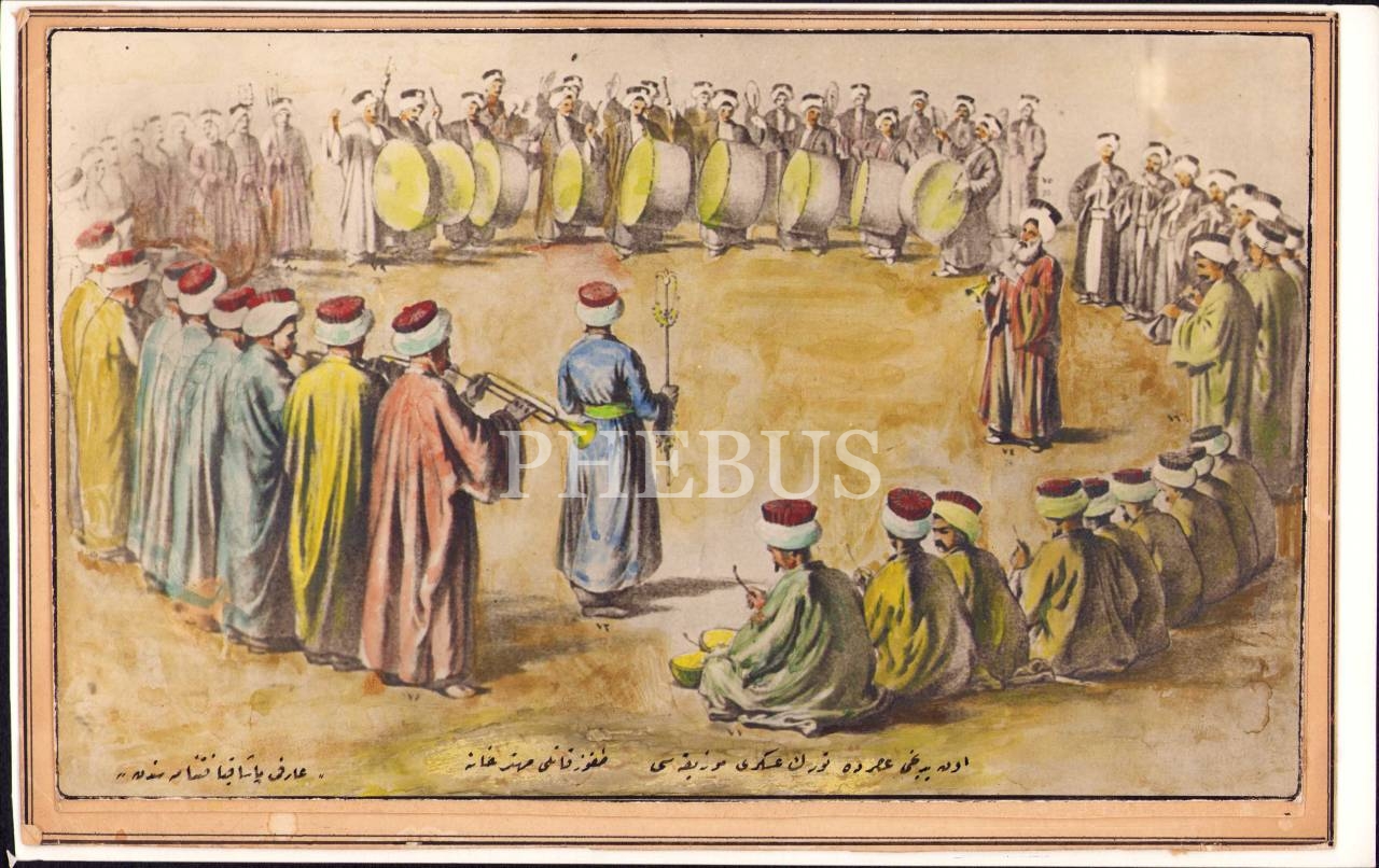 17.yy'da Türk Askerî Muzikası - Dokuz Katlı Mehterhâne, Arif Paşa Kıyafetnâmesi'nden, paspartulu, 16x27 cm