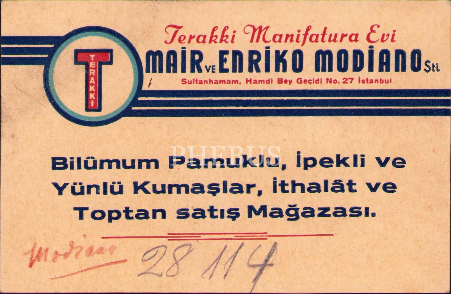 Terakki Manifatura Evi-Mair ve Enriko Modiano Şti. reklam kartı, 8x12 cm