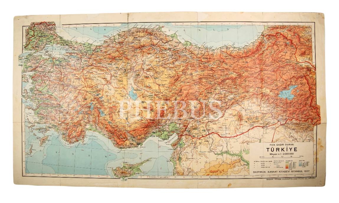 Türkiye Haritası, Faik Sabri Duran, Kanaat Kitabevi, İstanbul 1937, 48x 85 cm, yıpranmış ve tamirli haliyle