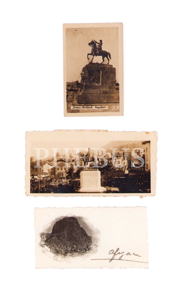 Gazi Heykeli, İzmir Atatürk Heykeli ve Afyon'a ait 3 adet fotoğraf, çeşitli boyutlarda (ortalama 4x8 cm)