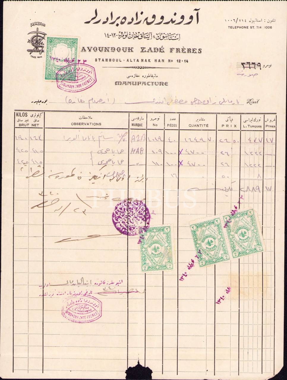 Osmanlıca-Fransızca Avondokzâde Biraderler antetli fatura, 1340 tarihli, 23x30 cm, alt kenarı yırtık haliyle