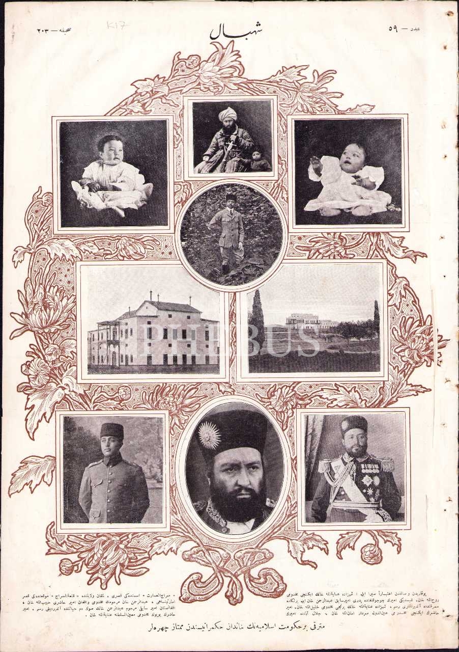 Kapak yazısı: "Müterakkî bir hükümet-i İslâmiyyenin hânedân-ı hükümrânîsinden mümtaz çehreler", "Yukarıdan ve sağdan itibaren sıra ile: Şehzade İnayetullah Han'ın ikinci mahdumu Ruhullah Han..."
