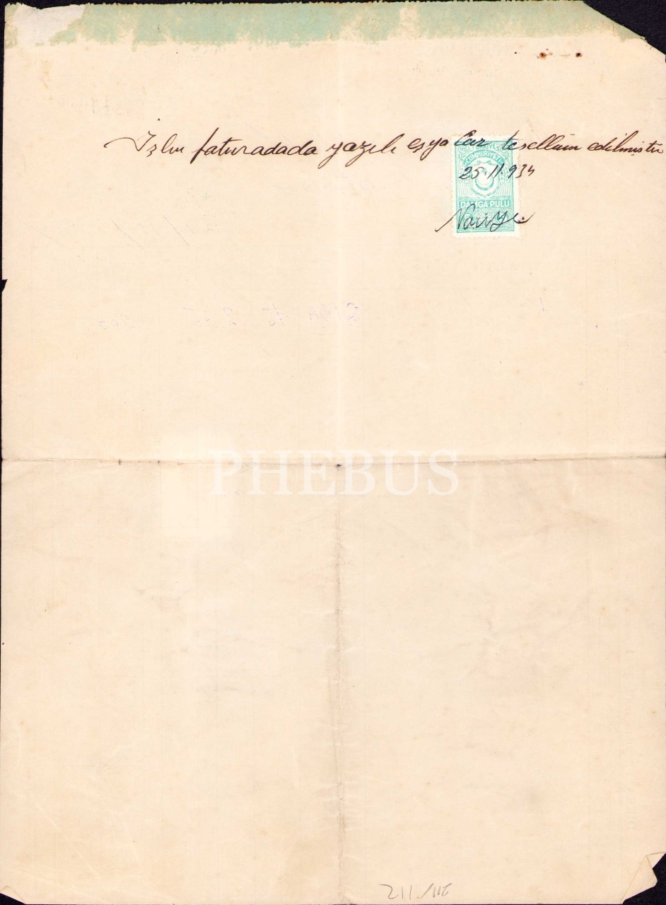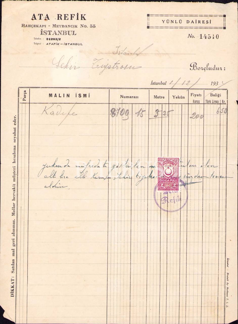Ata Refik antetli ve İstanbul Şehir Tiyatrosu'na ait fatura, 1932 tarihli, 21x29 cm, yıpranmış haliyle