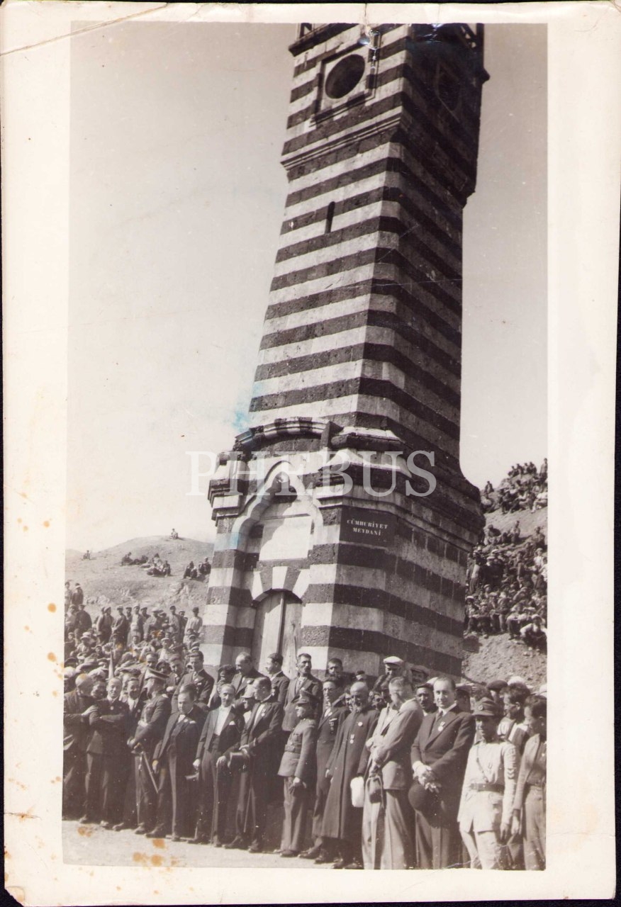 Cumhuriyet Meydanı tabelalı anıt önünde hatıra fotoğrafı, 16x23 cm, üst köşesi kırık ve yıpranmış haliyle