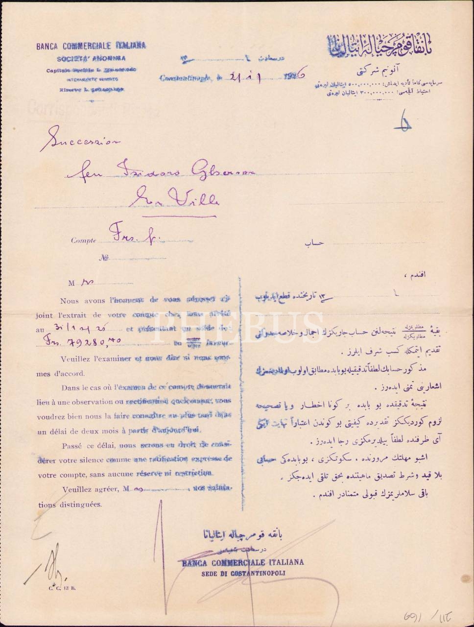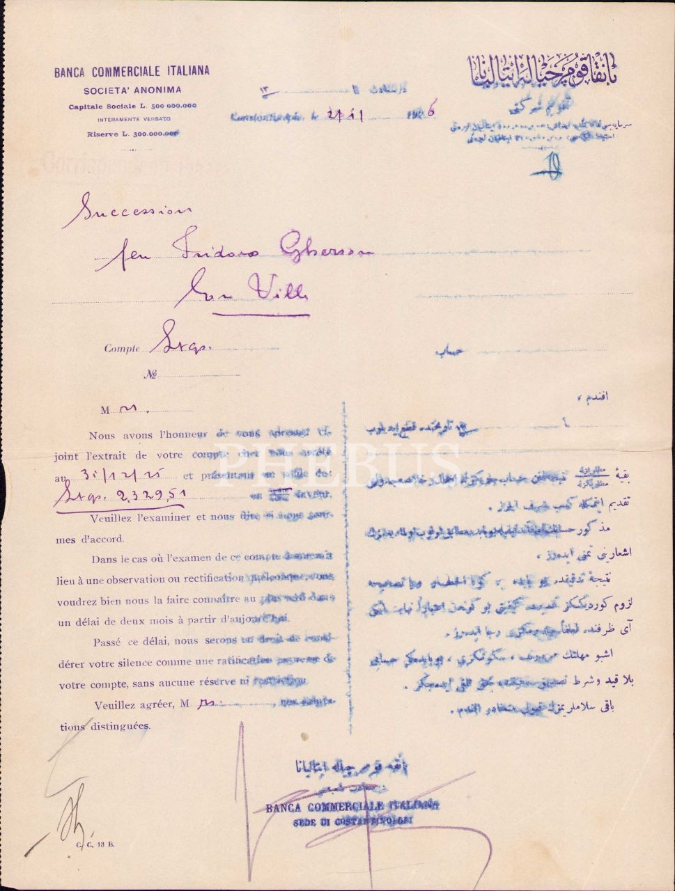 İtalyanca-Osmanlıca İtalyan Ticaret Bankası antetli 2 adet evrak, 1926 tarihli, 22x29 cm, yazılarının bir kısmı su ile karışmış haliyle