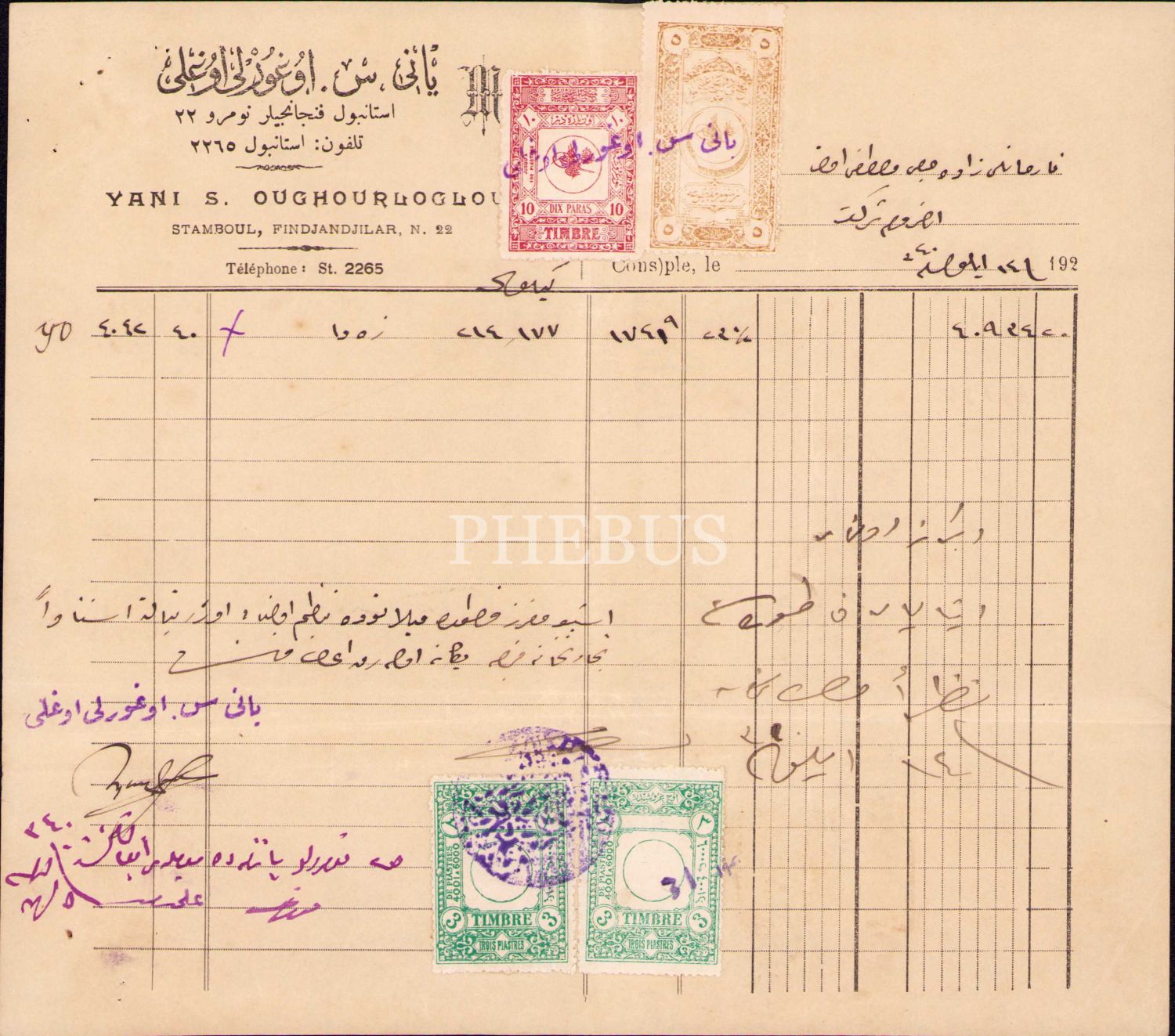 Osmanlıca Yani S. Uğurluoğlu antetli fatura, 1340 tarihli, 20x22 cm