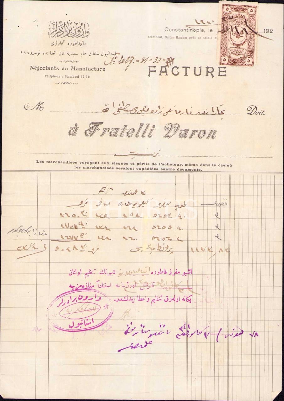 Osmanlıca-Fransızca Varon Biraderler antetli 1340 tarihli fatura, 20x28 cm