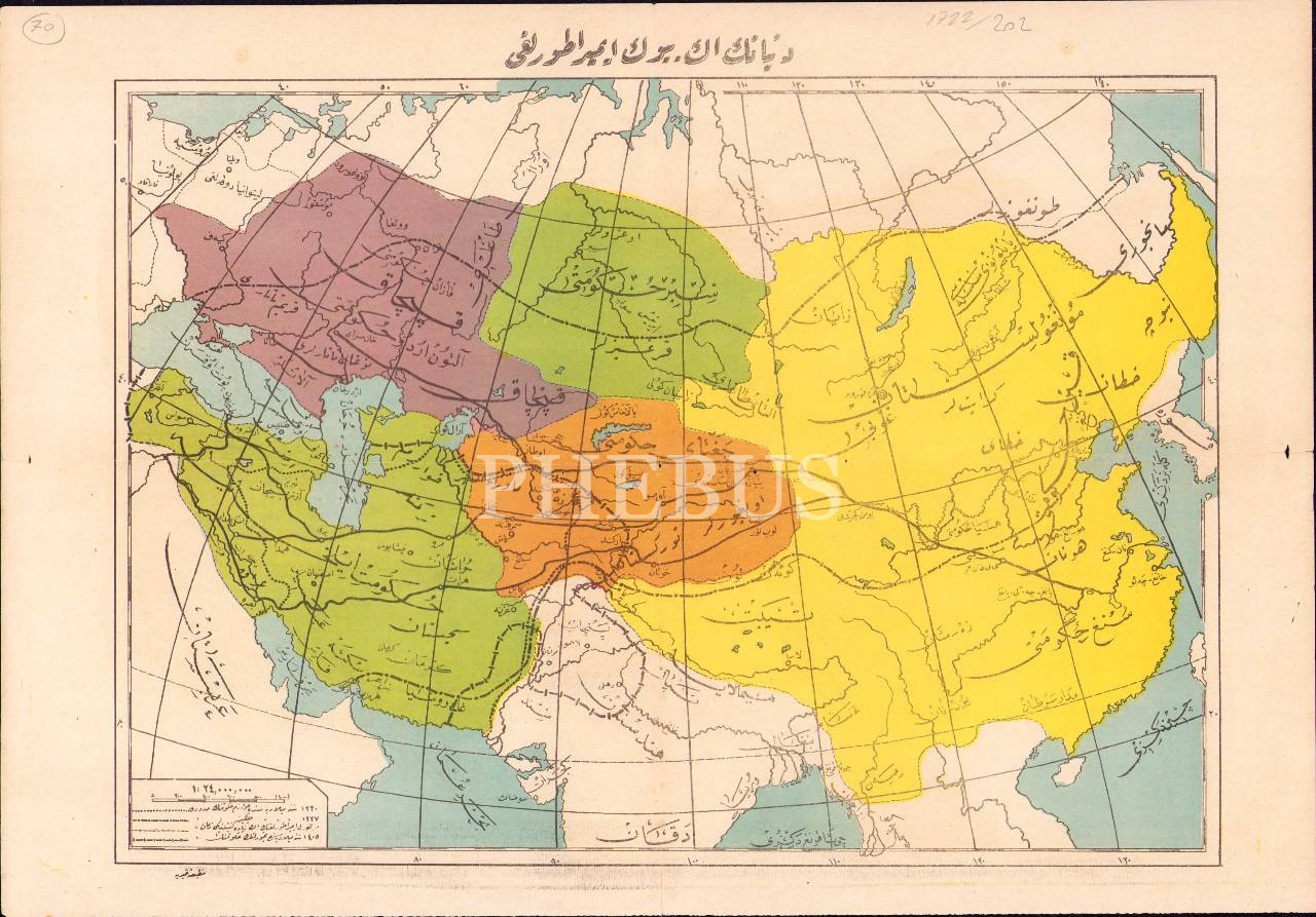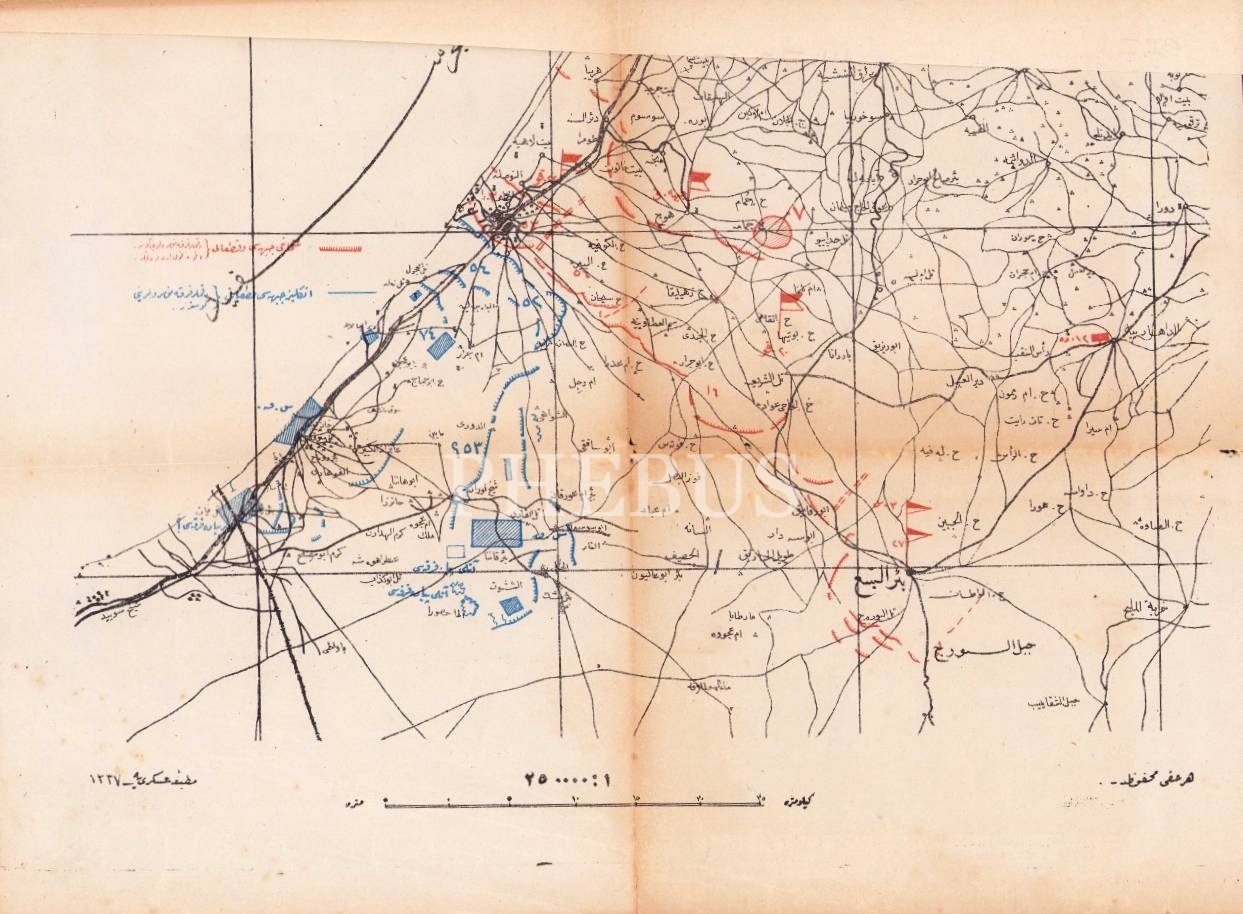 Osmanlıca "Dünyanın En Büyük İmparatorluğu" haritası ile İngiliz-Osmanlı hükümetlerinin Filistin cepheleri kıtalarını gösterir harita, 28x40 cm