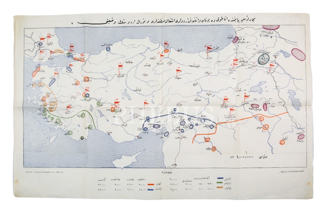 Osmanlıca Milli Mücadele başlarında Anadolu'da Yunan ve İtilaf orduları işgal bölgeleri ve Türk ordusunun durumunu gösterir harita, Ahmed İhsan Matbaası, 29x47 cm