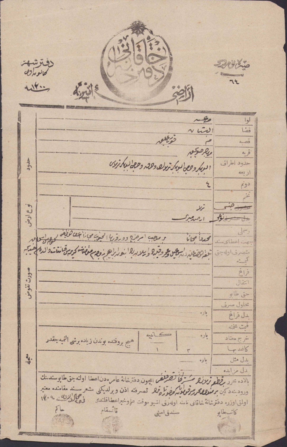 Osmanlıca arazi Tapu Senedi, Defteri Hakani, 1304, 18x28cm