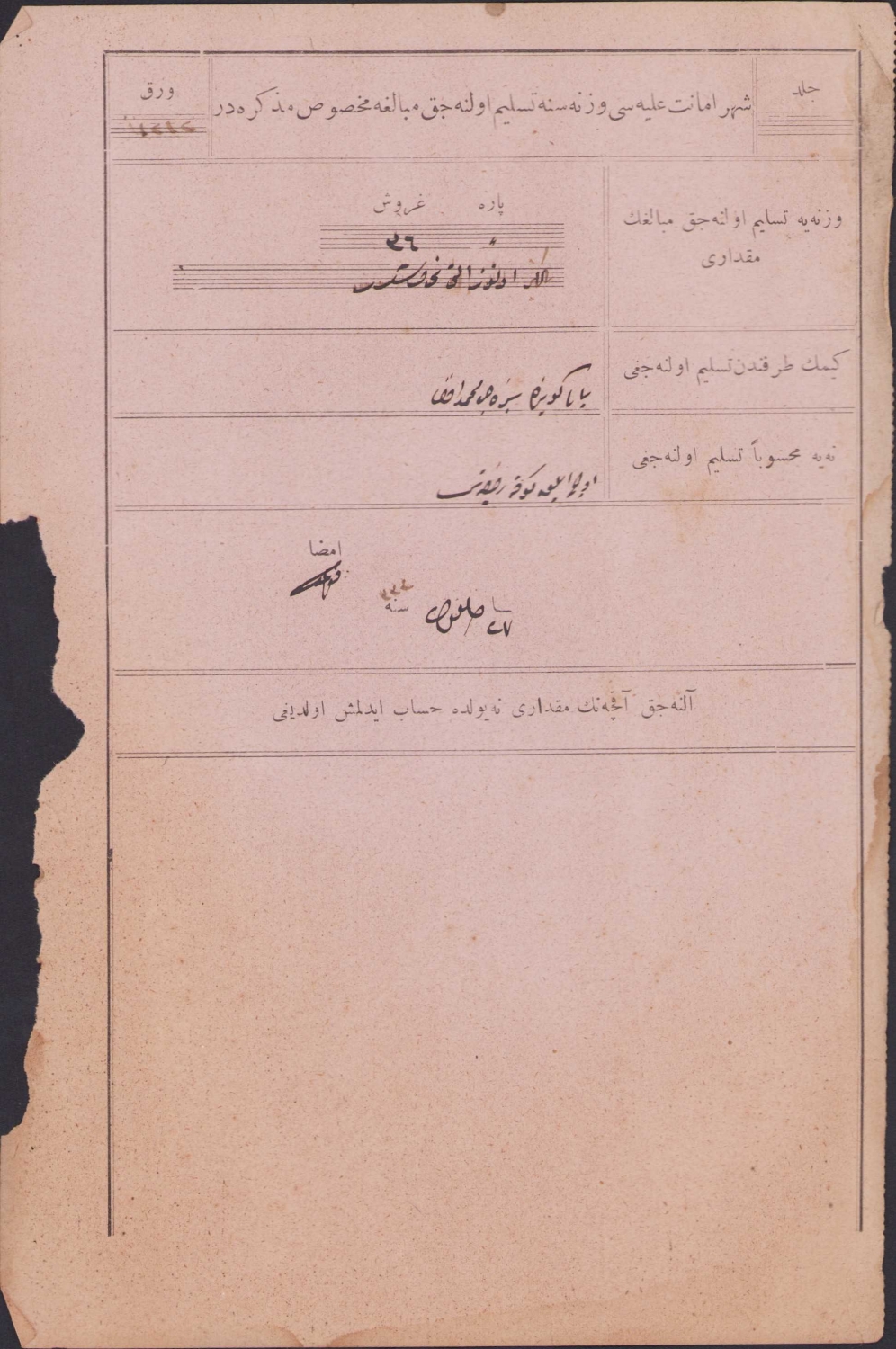 Osmanlı İstanbul Şehremaneti Veznesine Teslim Olunan Meblağa Mahsus Müzekkire (makbuz), imzalı, 15x25cm