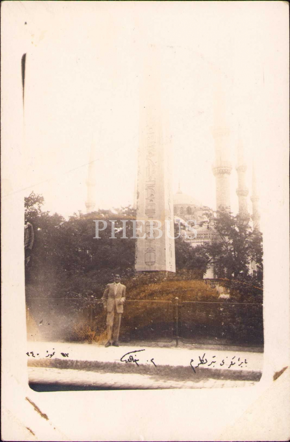 Sultanahmet Dikilitaş önünde şahıs hatıra fotoğrafı, 1340 tarihli, alt köşe soyulmuş haliyle