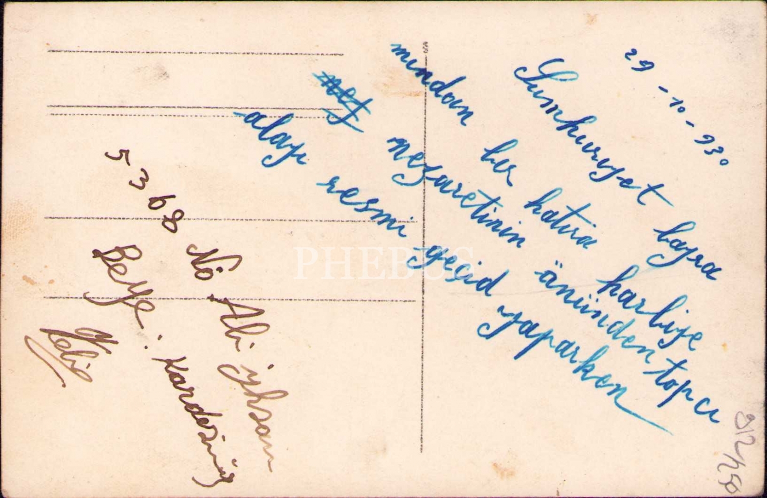 Arkasında 1930 tarihli Cumhuriyet bayramındaki resmi geçit olduğu belirtilmiştir.