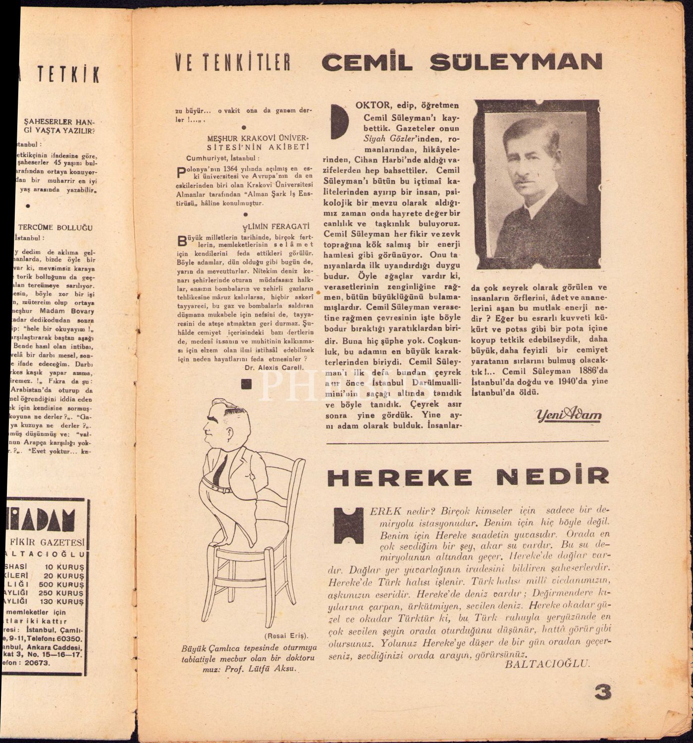 İsmail Hakkı Baltacıoğlu tarafından 1 Ocak 1934 tarihinde çıkarılmaya başlayan kültür-edebiyat ve fikir dergisi Yeni Adam'ın yayın amacı, Baltacıoğlu tarafından şu sözlerle açıklanmıştır: "Her gazete, sahibinin tabiatını taşır, benim gazetem de bana benzeyecektir. Yaratıldığım günden beri demokratça yaşadım, ölünceye kadar da demokrat kalacağım. Bütün yaşayışımda güzellik, iyilik ve doğruluk için çalıştım. Gazetem bu ülkülere hıyanet edemez."