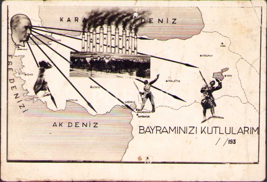 Atatürk, altı ok ve Türkiye haritası görselli bayram tebriği, 6x9 cm, epey yıpranmış haliyle