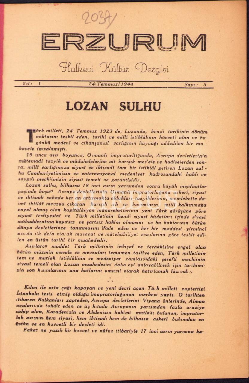 Erzurum Halkevi Kültür Dergisi 3. sayı, 24 Temmuz 1944, 19x28 cm