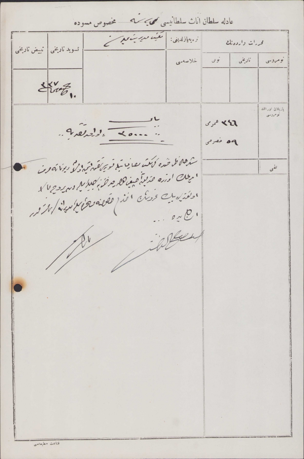 Adile Sultan İnas Mektebi muhasebeciliğine mahsus müsvette, 1337, Osmanlıca, 20x30cm