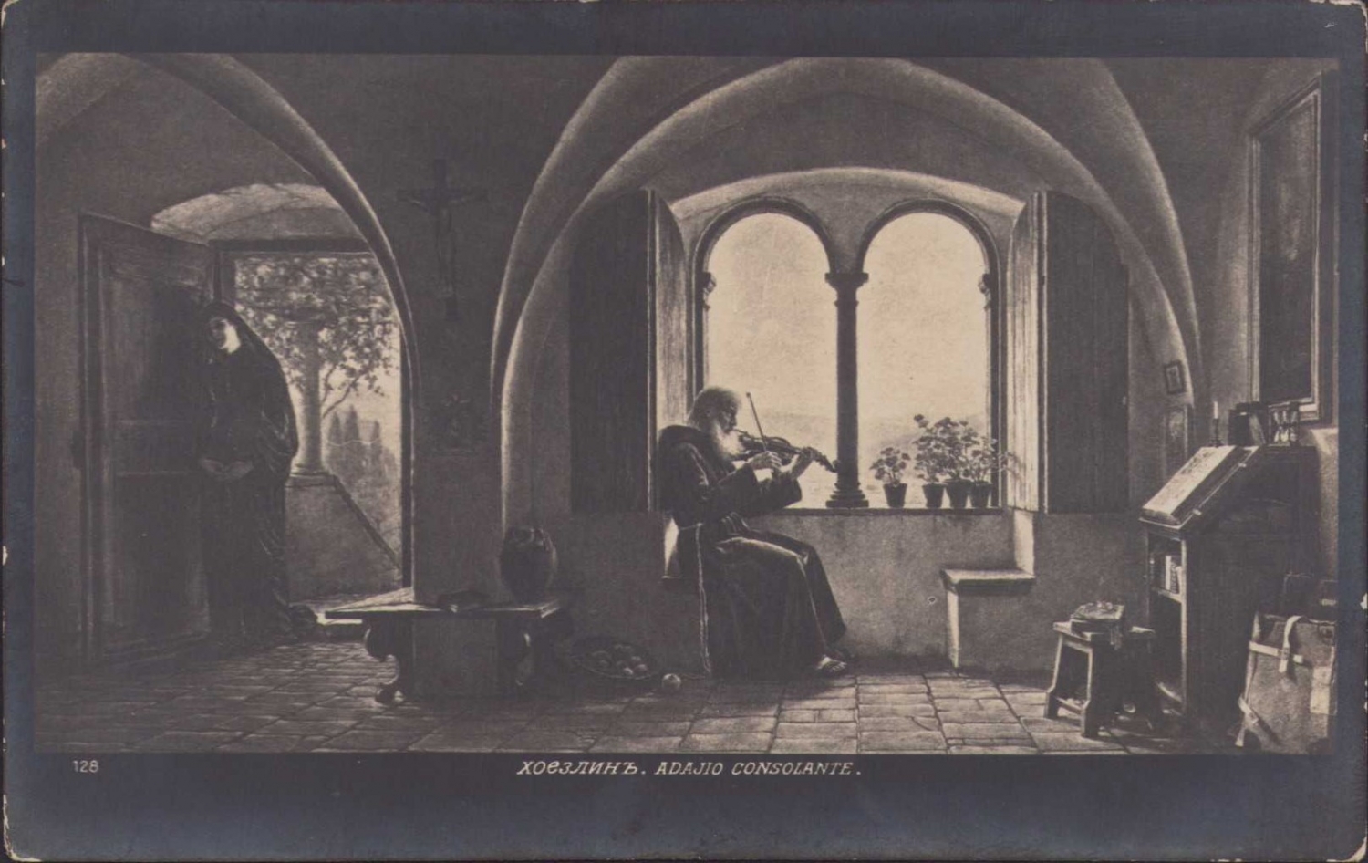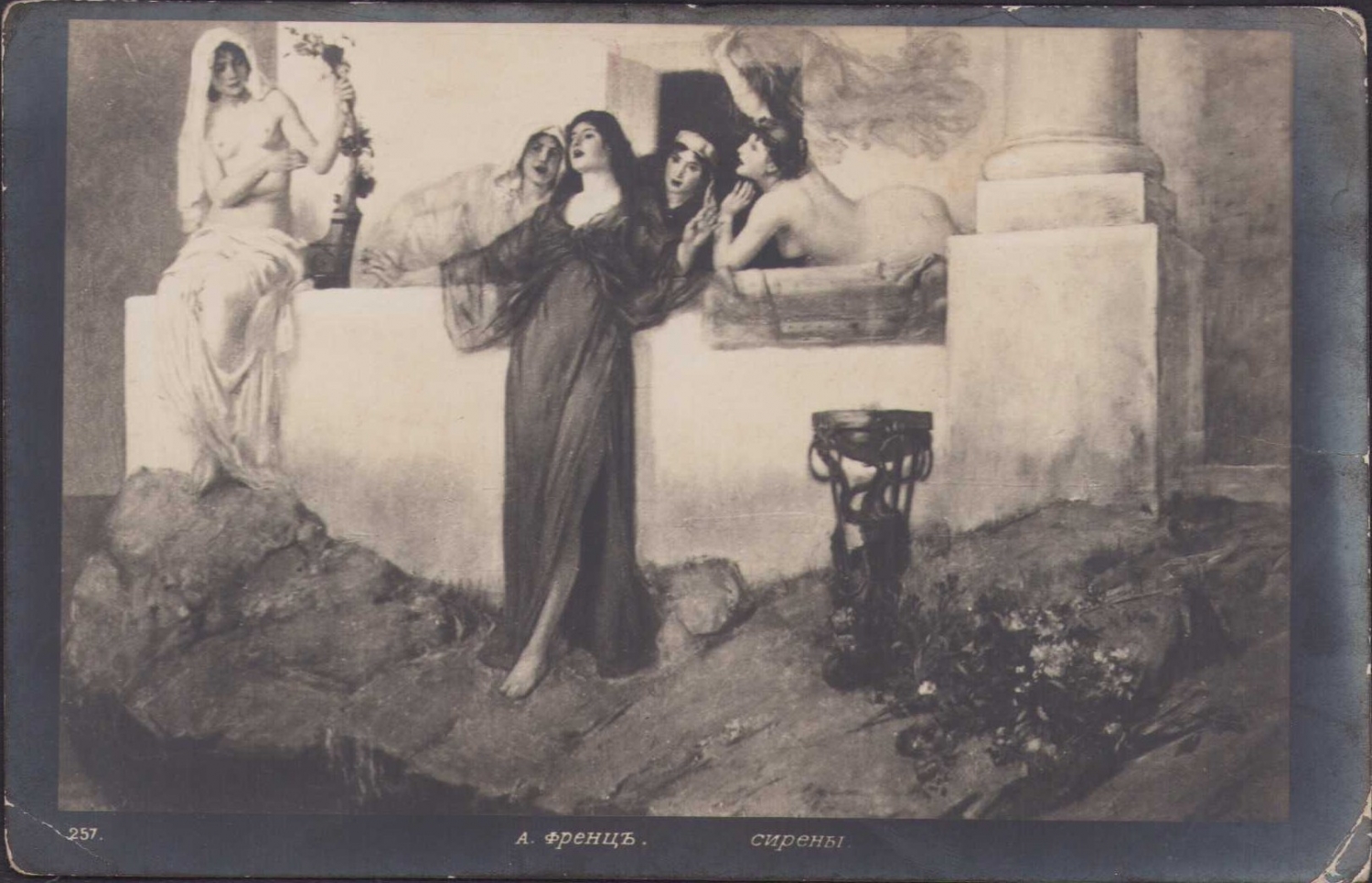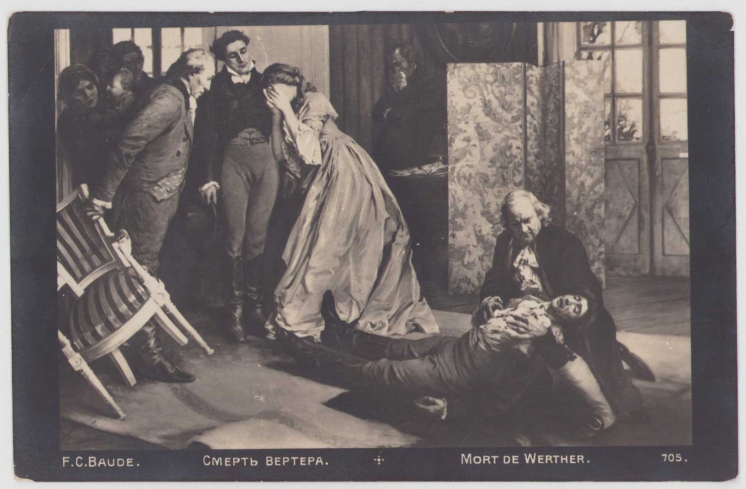 Rusça yazılı, yabancı baskı, eski dönem temalı 5 adet kartpostal, biri Faust, bir diğeri de Werther temalı