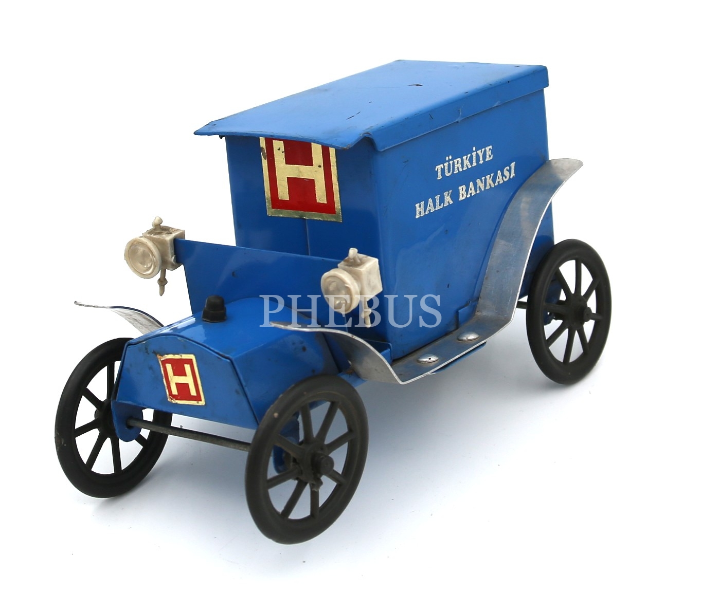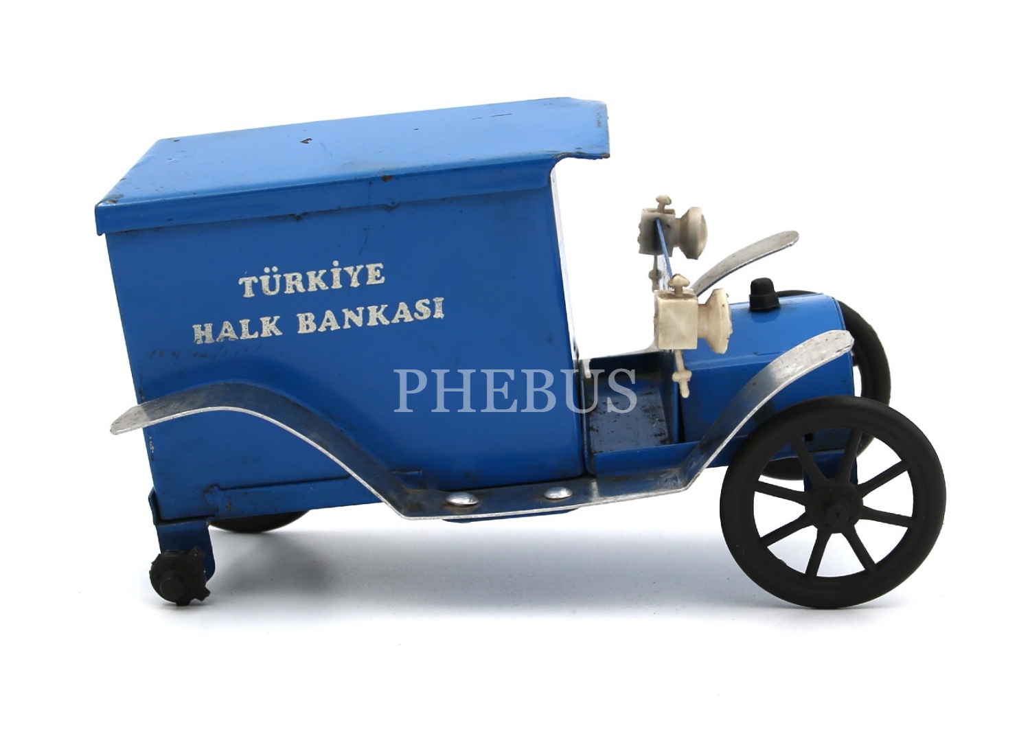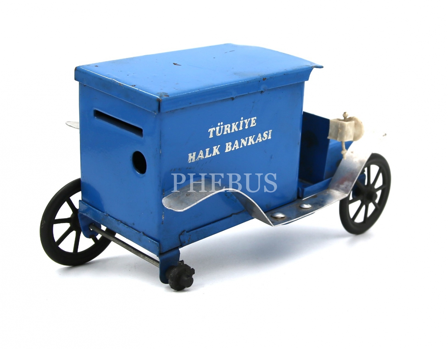 Türkiye Halk Bankası araba formunda metal kumbara, 15x9x7 cm, bir tekerlek çıkık, bir tekerlek eksik haliyle