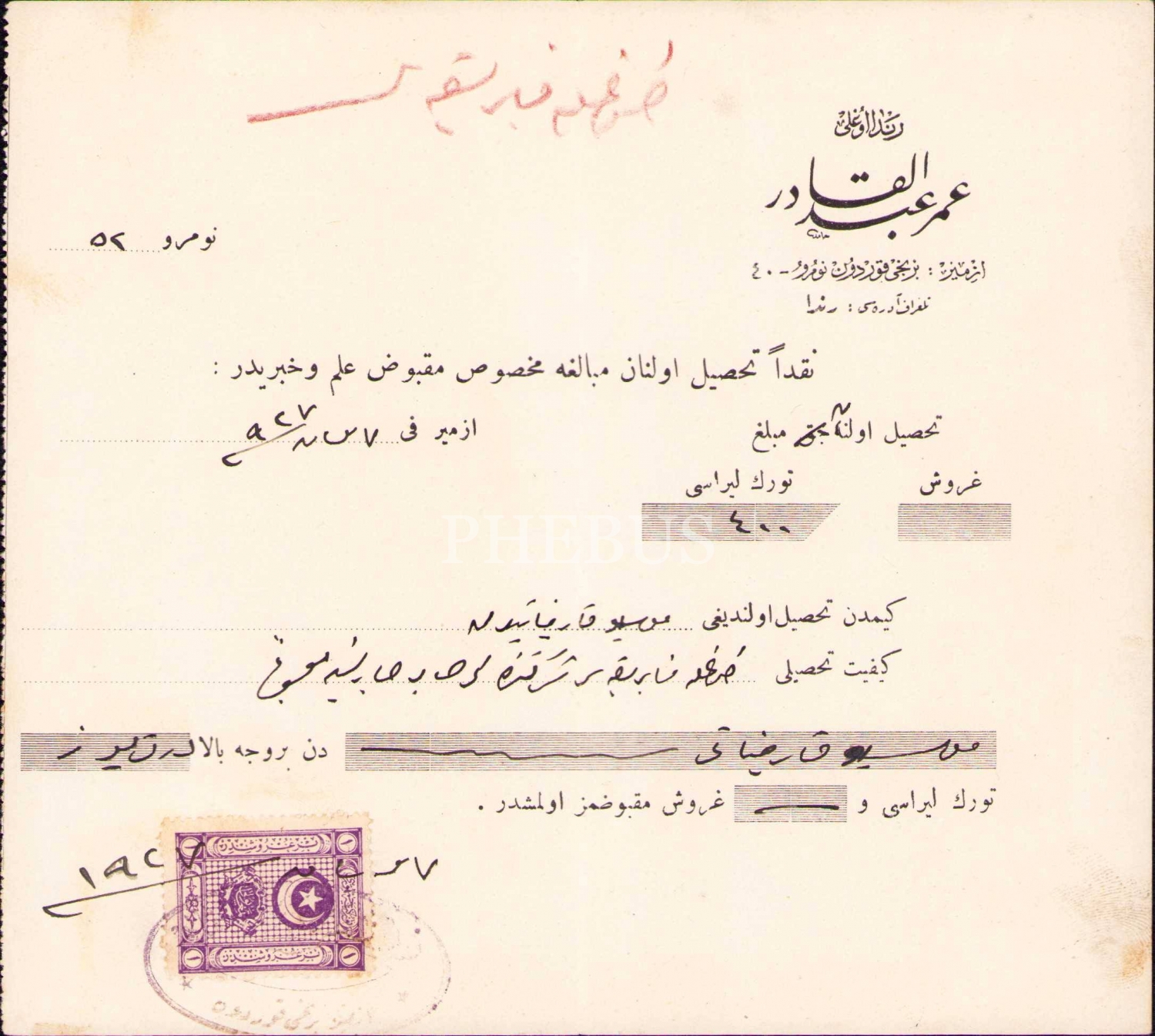 Osmanlıca Ömer Abdülkadir-İzmir antetli makbuz, 1927, 16x18 cm