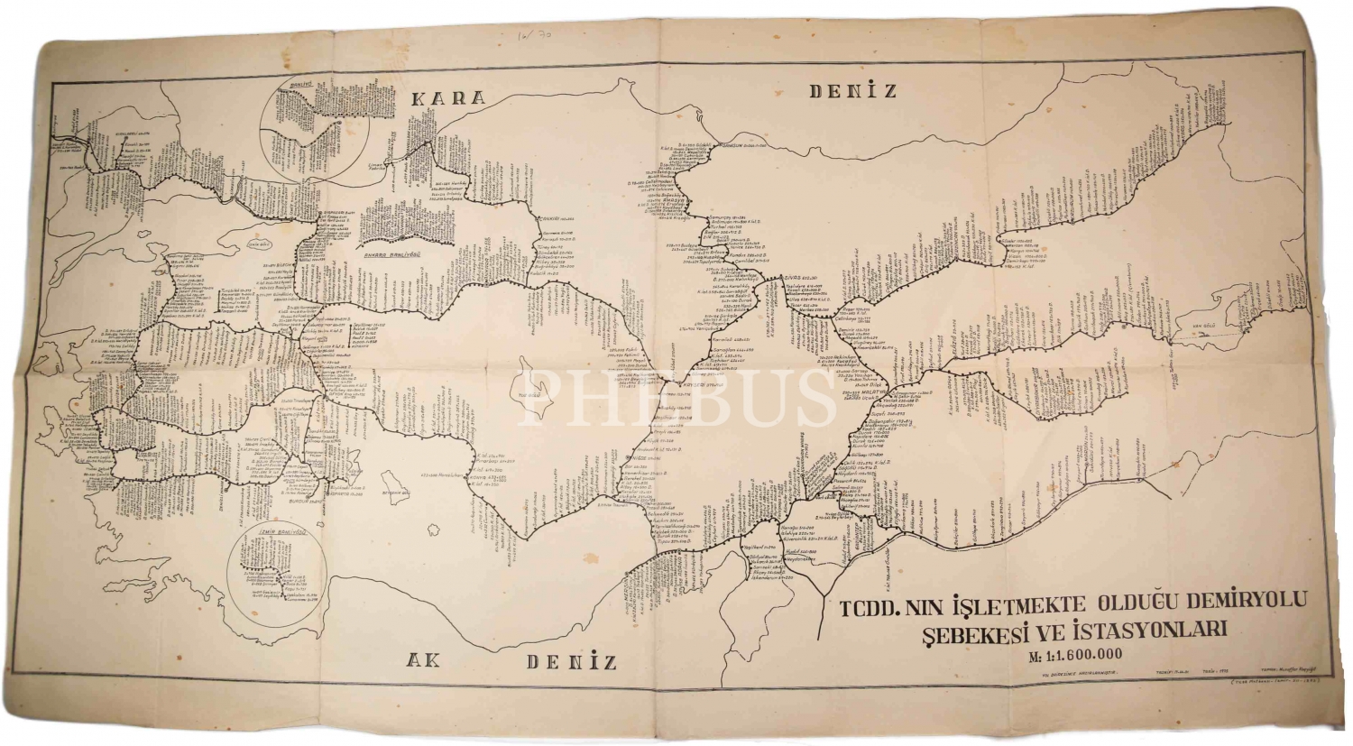 TCDD Demiryolu Ağı ve İstasyonları haritası, İzmir 1975, 53x99 cm, yıpranmış haliyle