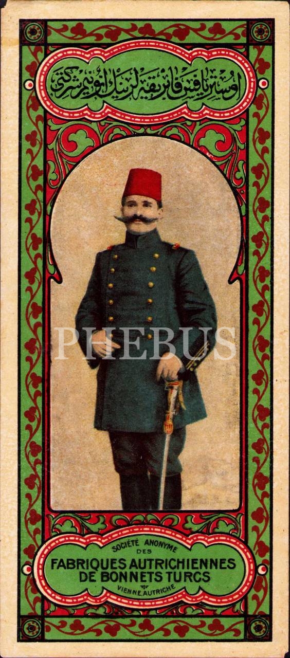Resneli Niyazi görselli fes etiketi, Osmanlıca Avusturya Fes Fabrikalarının Anonim Şirketi antetli, 11x25 cm, üst köşesi kırık haliyle