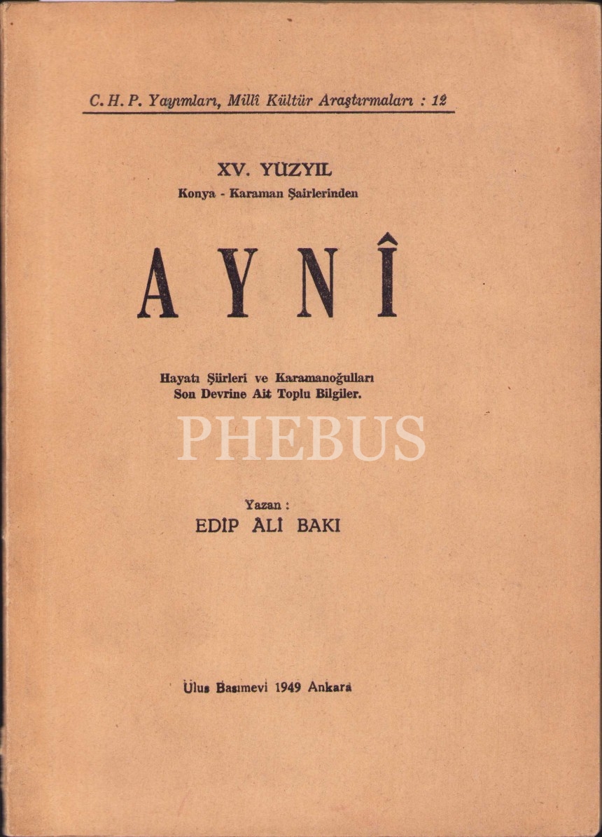 15. Yüzyıl Konya-Karaman Şairlerinden Aynî, Edip Âli Baki, C.H.P. Yayımları, Ulus Basımevi, Ankara 1949, 90 s., 17x24 cm