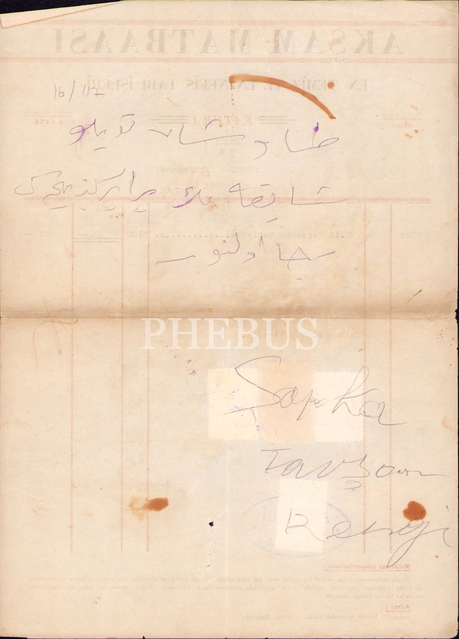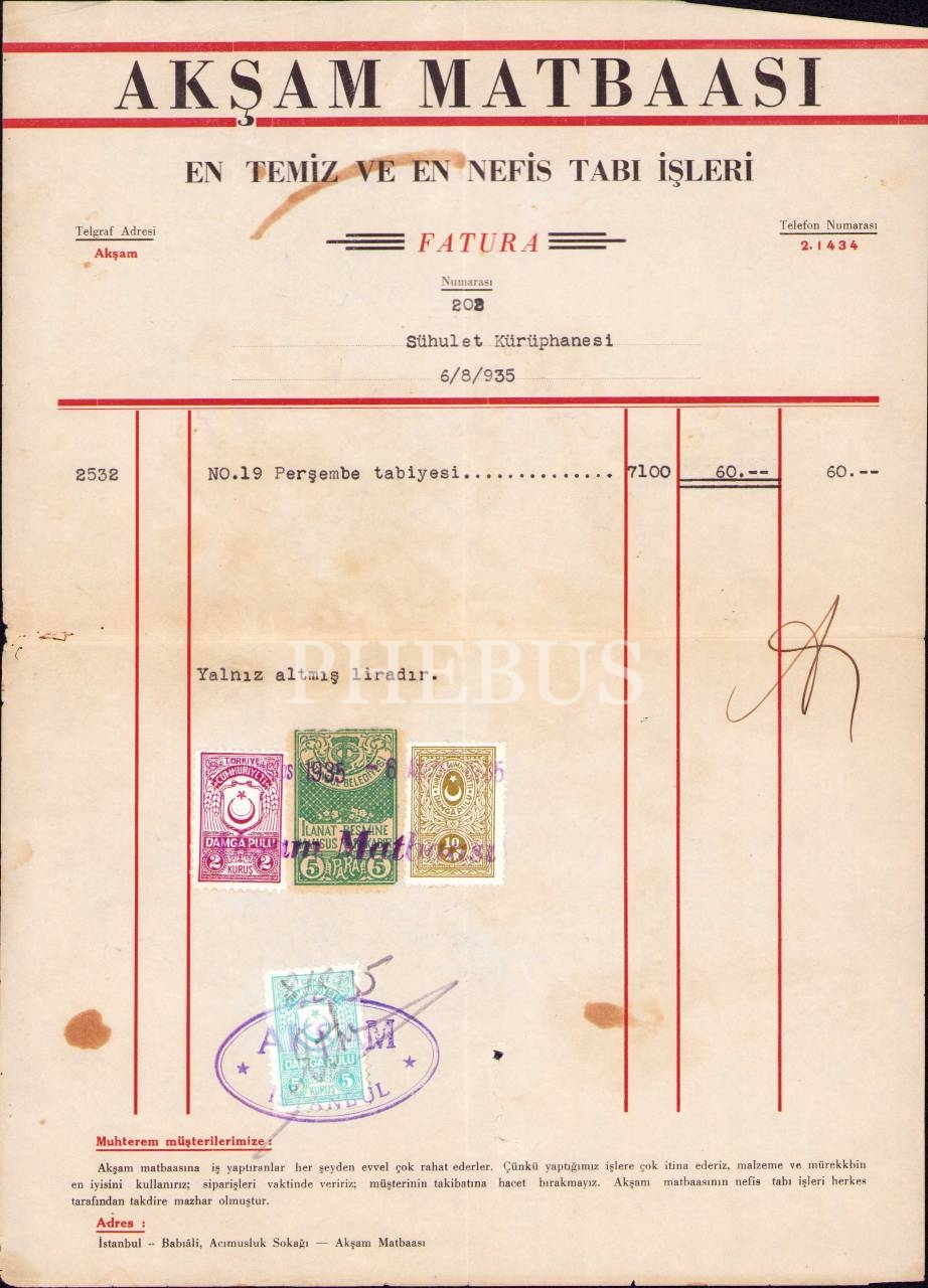 Akşam Matbaası antetli, Sühulet Kütüphanesi'ne kesilmiş fatura, 1935, 21x29 cm
