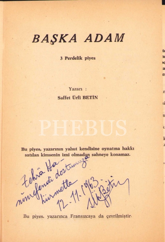 Başka Adam [Tiyatro], Saffet Ürfi Betin, ithaflı ve imzalı, İstanbul 1963,