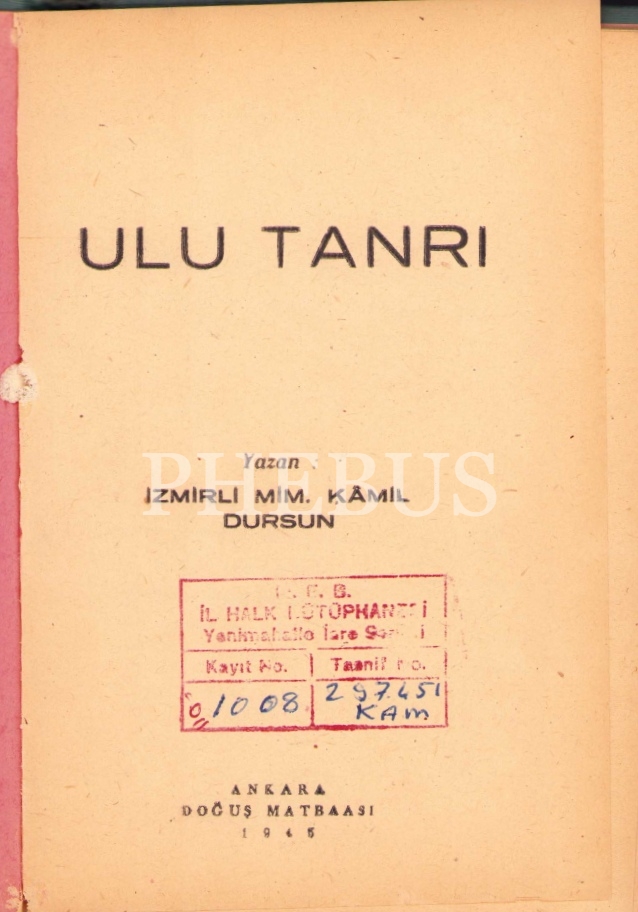 Ulu Tanrı, İzmirli Mim. Kâmil Dursun, Doğuş Matbaası, Ankara 1945, 44 s., 13x19 cm
