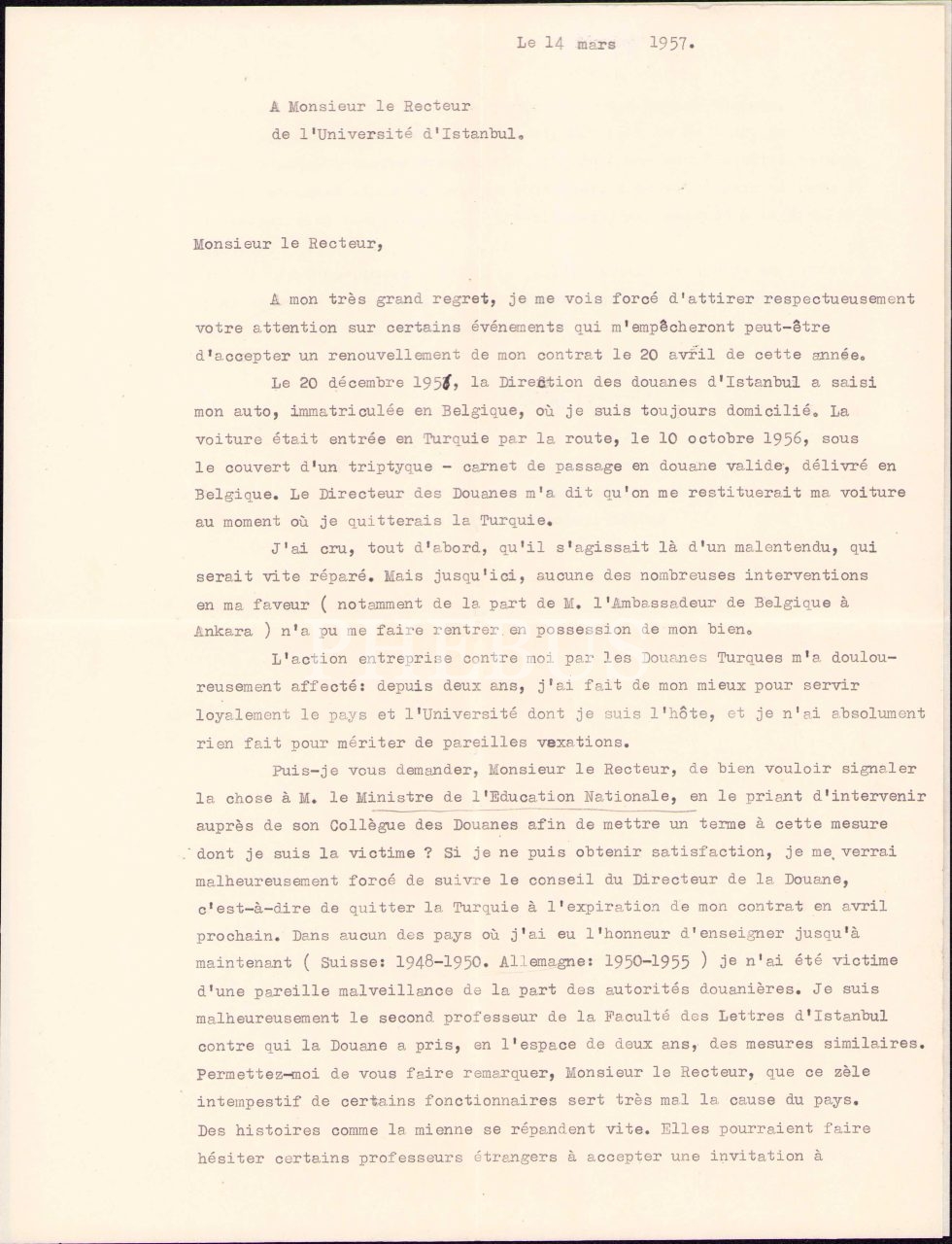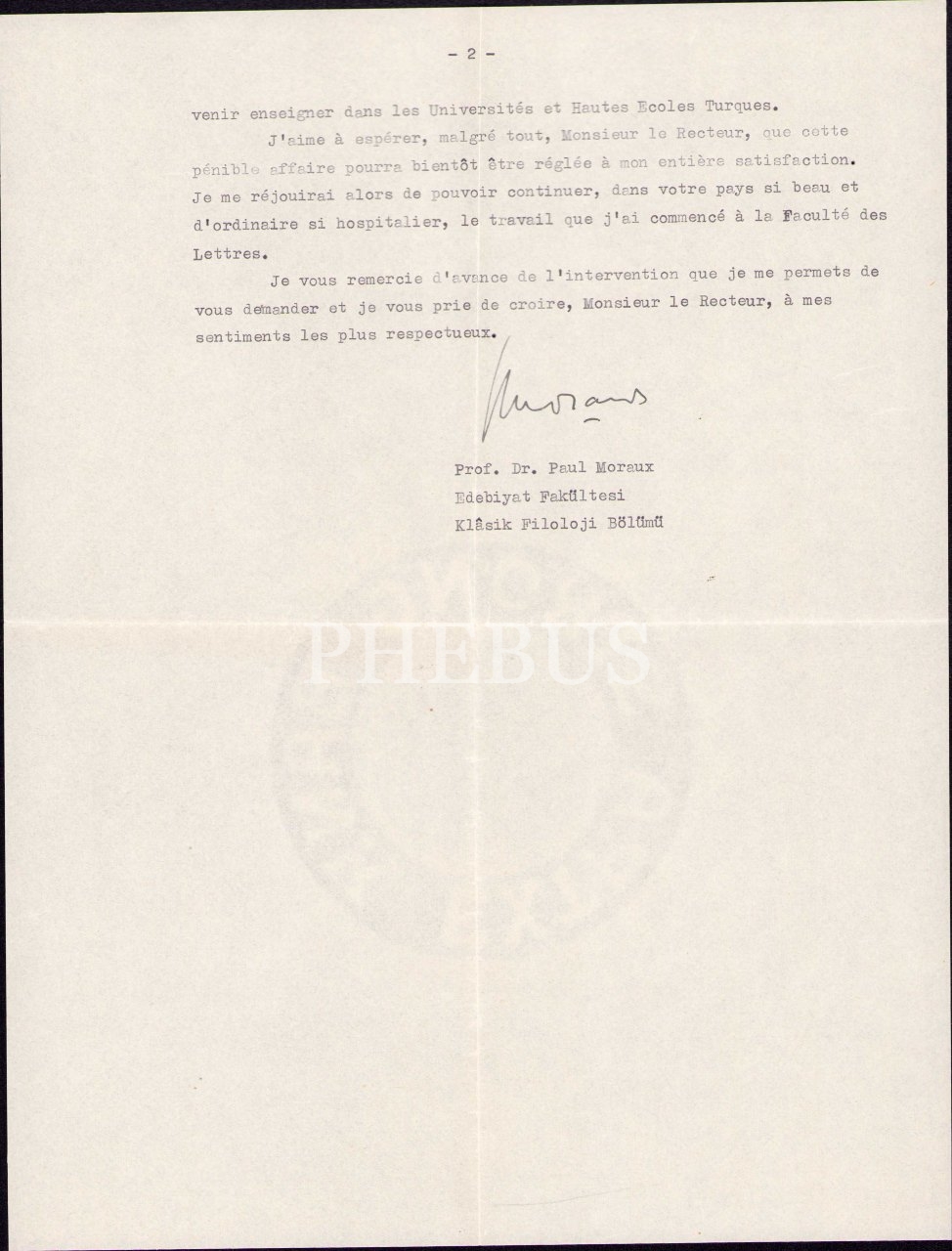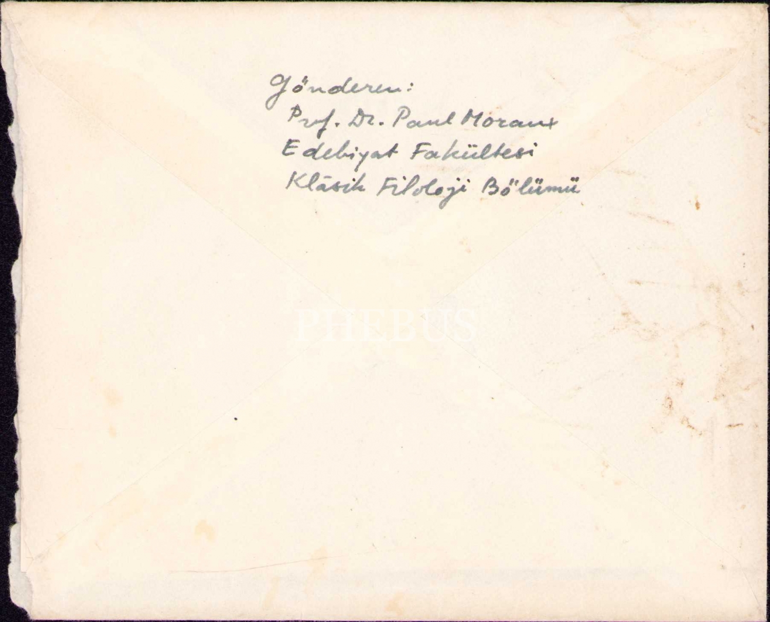 İstanbul Üniversitesi Rektörü'ne hitaben yazılan Fransızca mektup ve zarfı, Edeb. Fak. Klasik Filoloji Bölümü'nden Paul Moraux tarafından yazılmış, 1957, 2 sayfa, zarfı yırtık haliyle